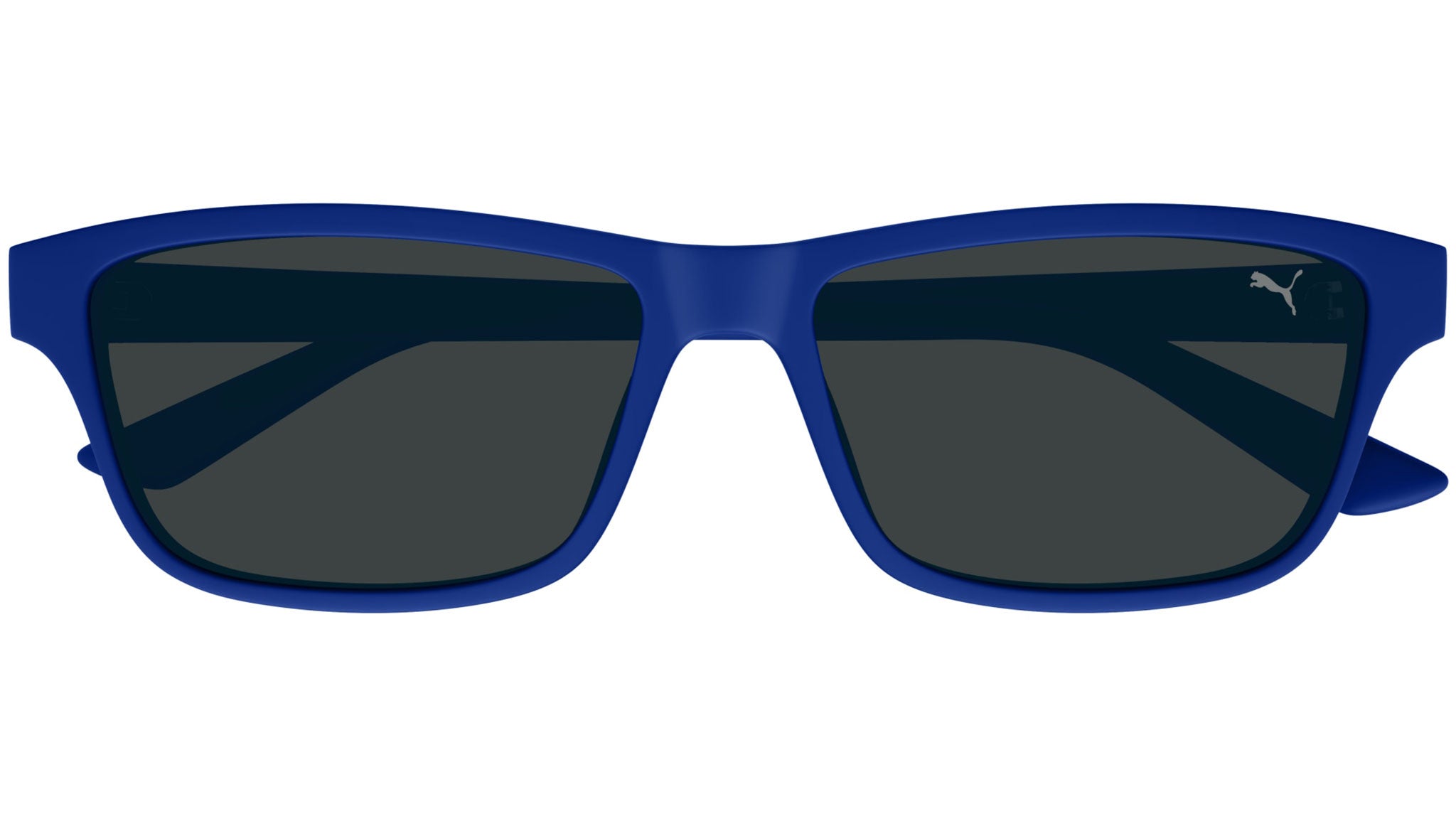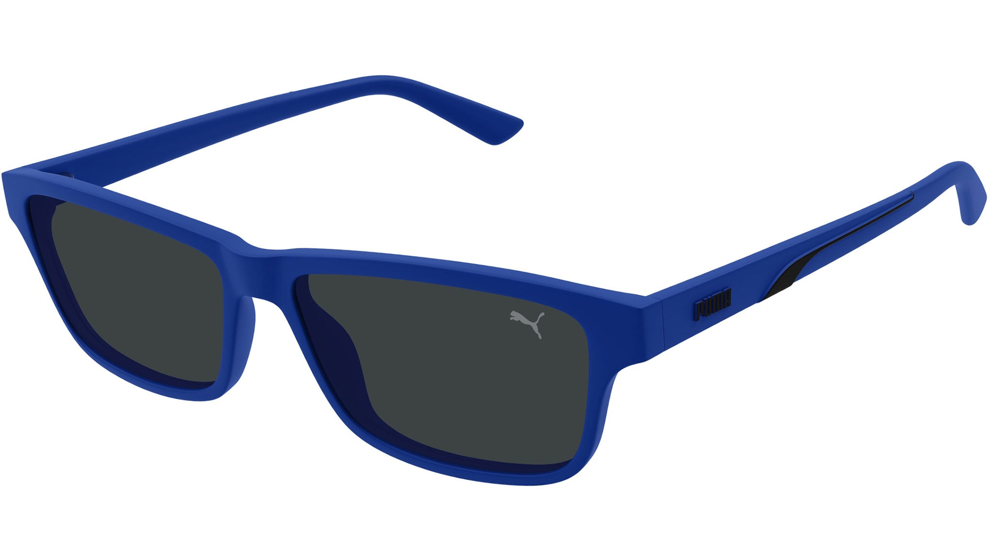 Occhiali da sole Puma Essential modello PU0469S variante colore 003 blu elettrico solido opaco con lenti color grigio fumo tinta unita. Rivenditore autorizzato Puma online. Gli occhiali vengono consegnati con custodia e accessori originali e sono coperti dalla garanzia ufficiale di 12 mesi del produttore.