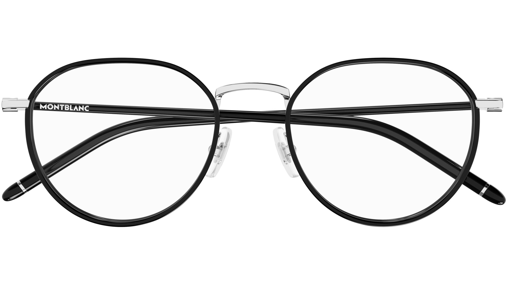 Occhiali da vista Montblanc modello MB0342OA linea Meisterstück forma panto in metallo, codice colore 001 argento lucido / rim nero solido con aste color nero e lenti demo.