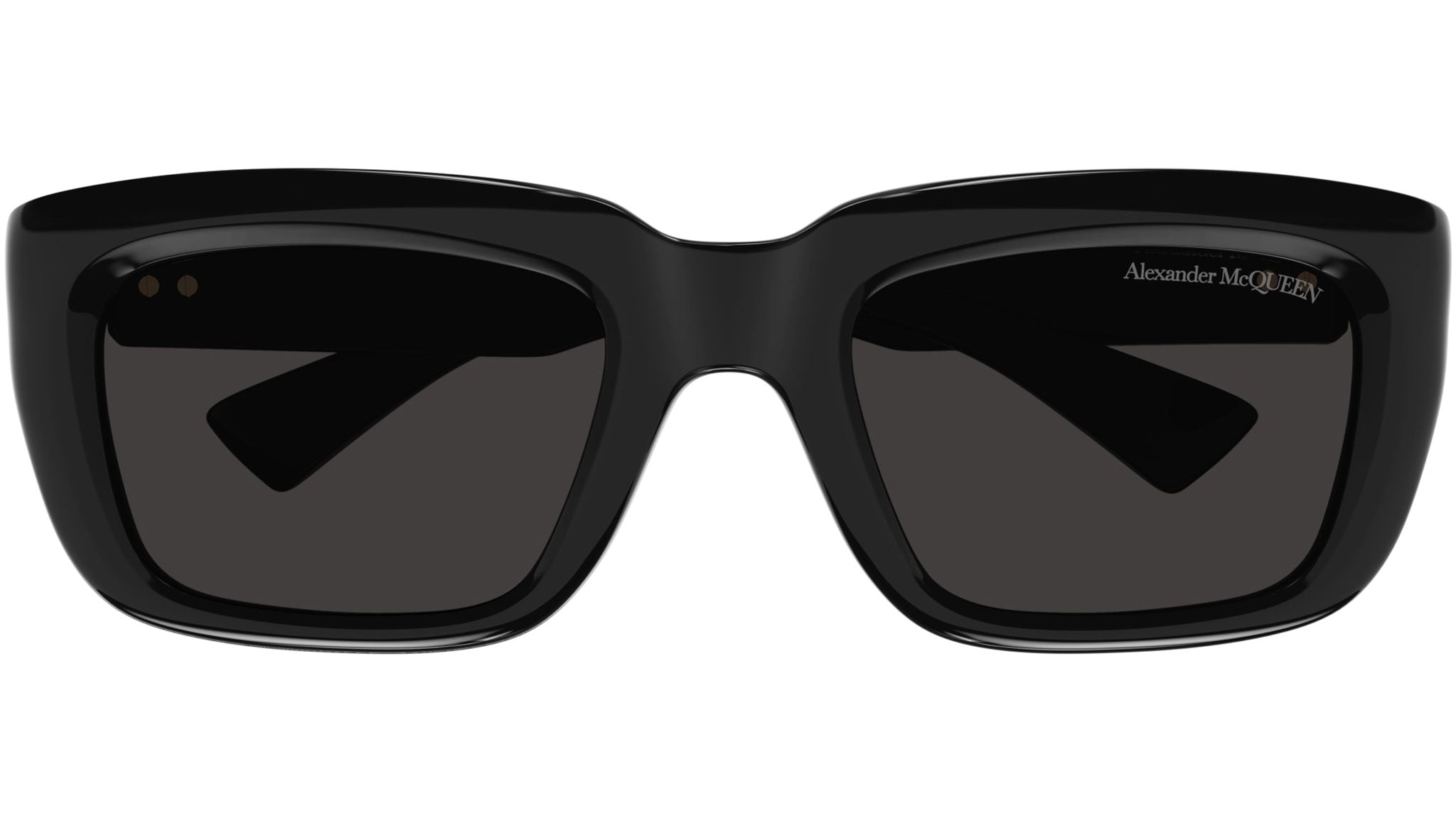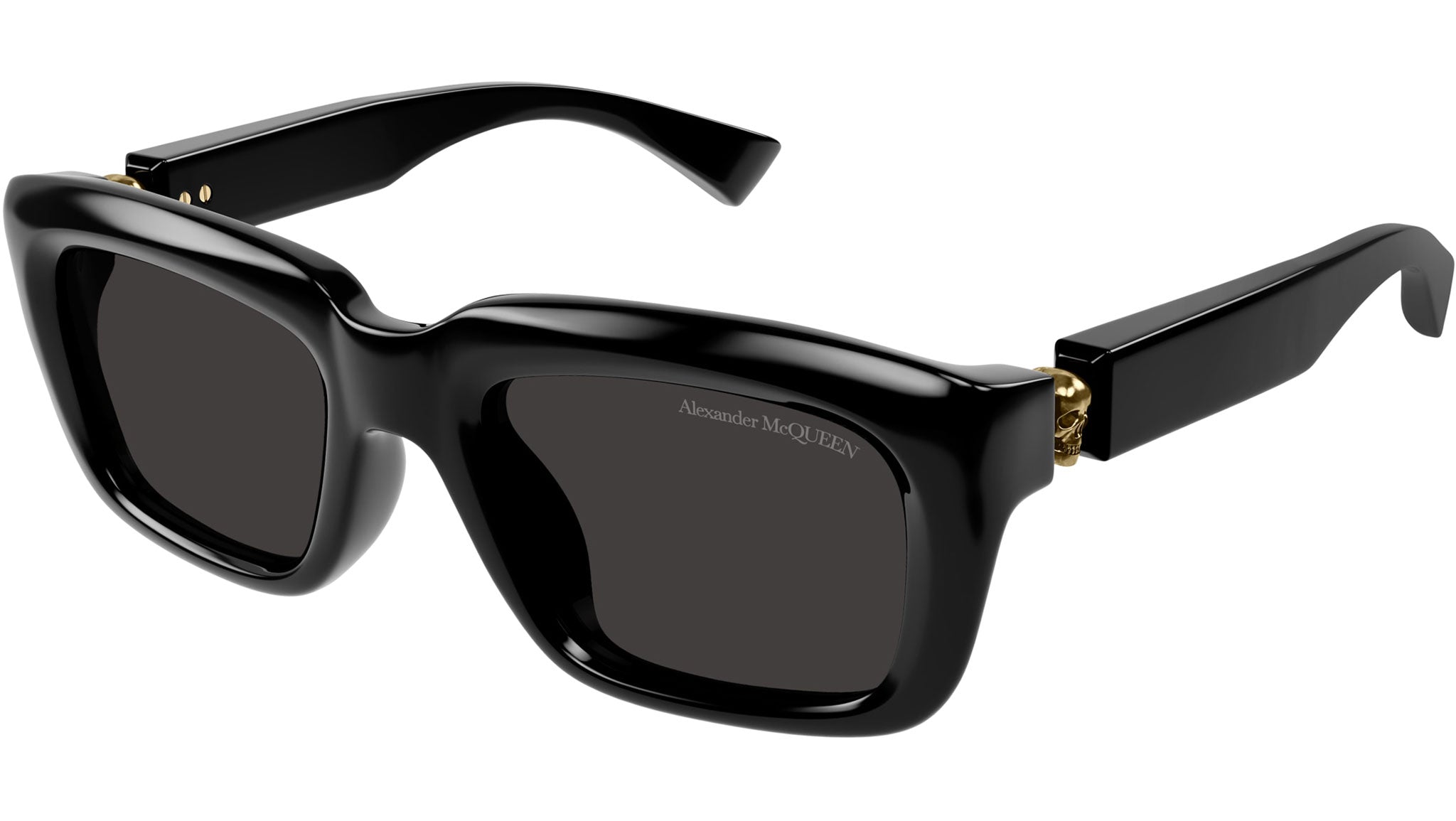 Occhiali da sole Alexander McQueen Icons modello AM0431S rectangle in acetato riciclato codice colore 001 nero lucido tinta unita con aste nero e lenti color grigio tinta unita.
