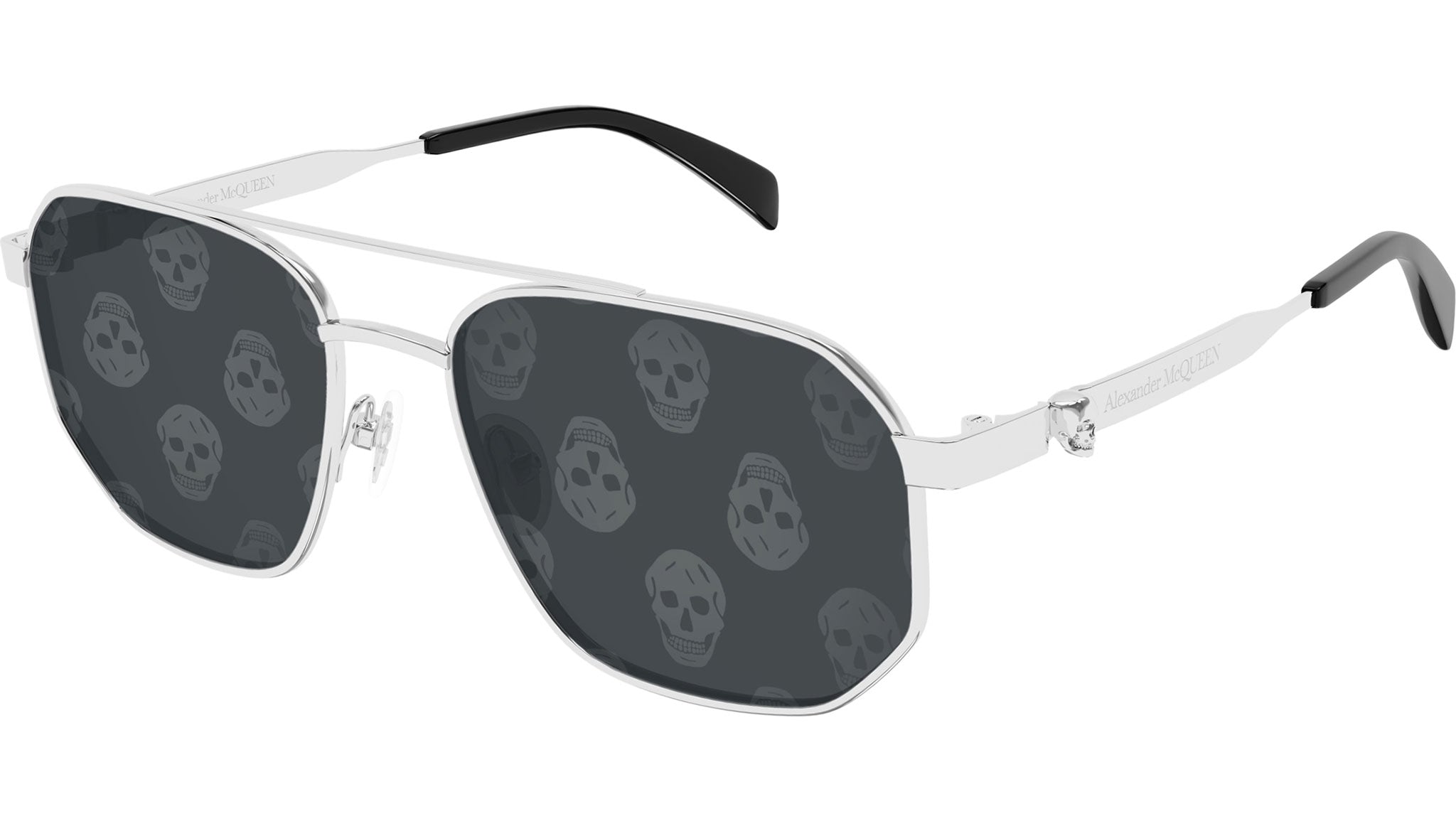Occhiali da sole Alexander McQueen Icons modello AM0458S aviator in metallo codice colore 004 argento lucido con aste argento e lenti color grigio solido + pattern teschi argento specchiato.