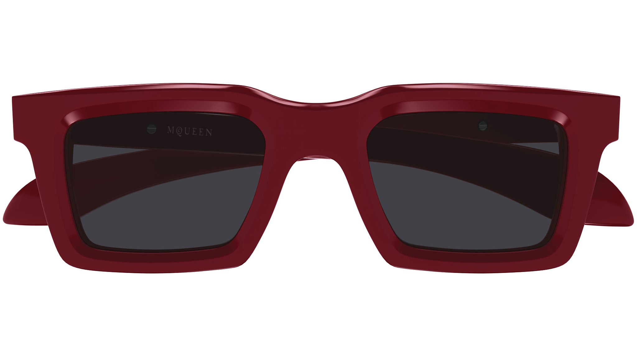 Occhiali da sole Alexander McQueen Skull modello AM0506S in acetato riciclato rettangolari codice colore 005 rosso tinta unita lucido con aste rosso e lenti color grigio tinta unita. Rivenditore autorizzato Alexander McQueen online. Gli occhiali vengono consegnati con custodia e accessori originali e sono coperti dalla garanzia ufficiale di 12 mesi del produttore.