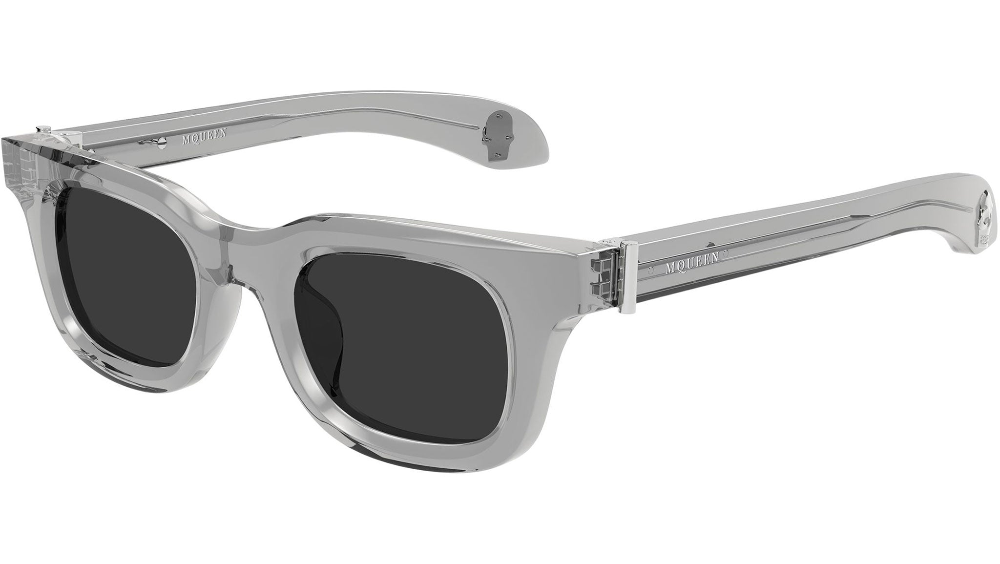 Occhiali da sole Alexander McQueen AM0547S 003 uomo con montatura rettangolare in acetato riciclato grigio trasparente lucido e lenti grigio tinta unita. Linea: Skull. Codice modello: AM0547S. Codice colore: 003. Made in Japan. Rivenditore autorizzato Alexander McQueen online. Gli occhiali vengono consegnati con custodia e accessori originali e sono coperti dalla garanzia ufficiale di 12 mesi del produttore.