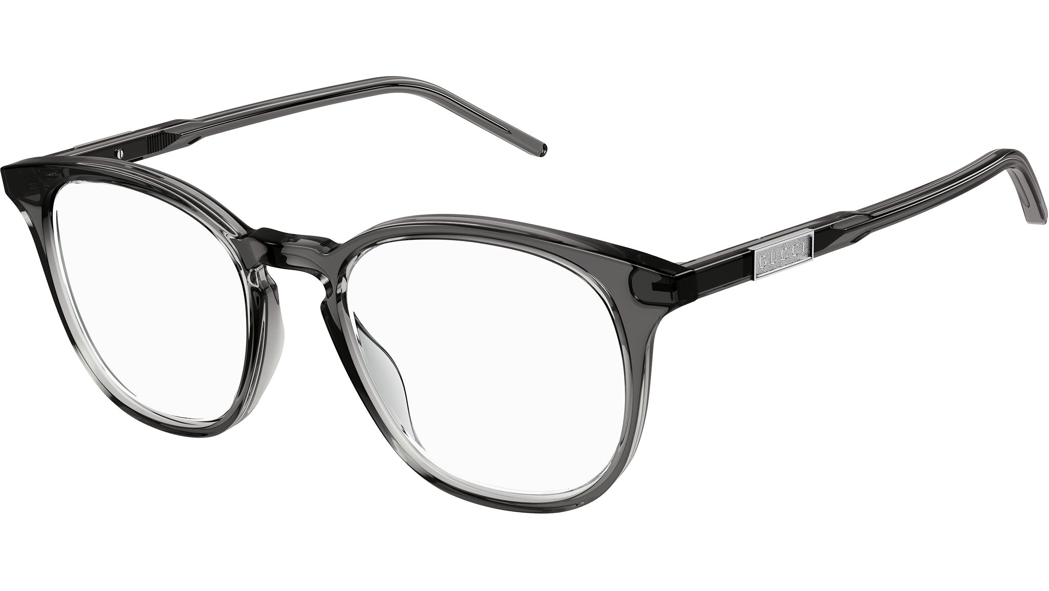 Occhiali da vista Gucci linea Gucci Logo modello GG1157O variante colore 005 grigio scuro trasparente lucido con astine color grigio.