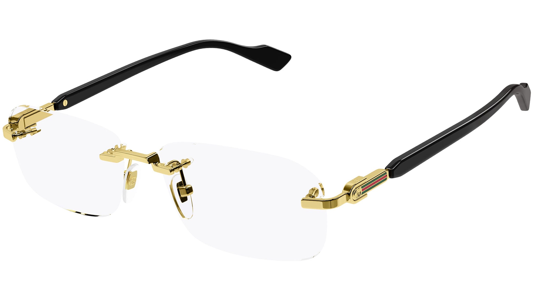 Occhiali da vista Gucci Logo modello GG1221O variante colore 001 oro giallo lucido con astine color nero.