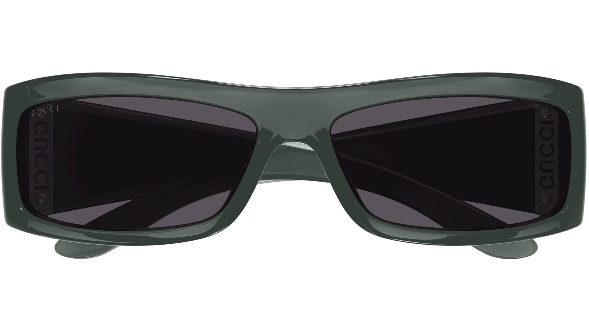 Occhiali da sole Gucci linea Fashion modello GG1492S 001 in iniettato verde oliva trasparente lucido con aste color verde e lenti grigio tinta unita.