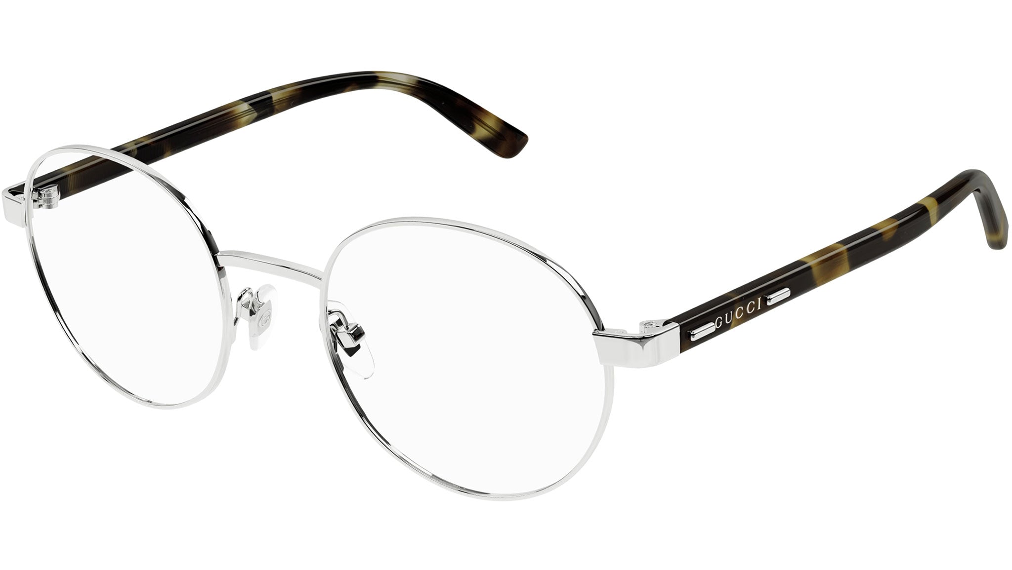 Occhiali da vista Gucci Lettering modello GG1585O pantos in metallo codice colore 002 argento lucido con astine tartaruga e lenti demo.