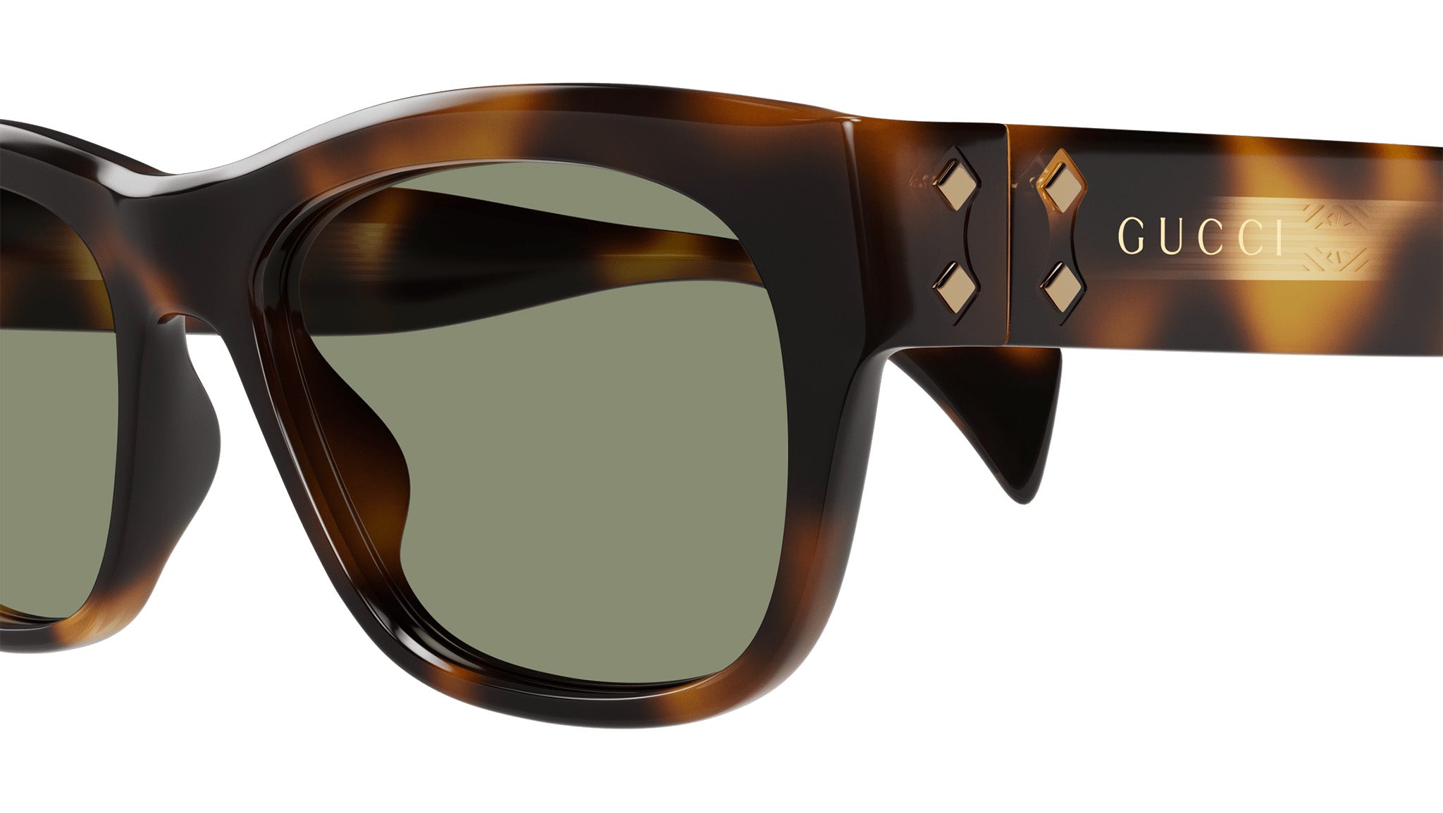 Occhiali da sole Gucci modello GG1706S linea Rivets in acetato riciclato forma rettangolare codice colore 002 marrone avana medio con aste tartaruga e lenti verde tinta unita. Rivenditore autorizzato Gucci online. Gli occhiali vengono consegnati con custodia e accessori originali e sono coperti dalla garanzia ufficiale di 12 mesi del produttore.