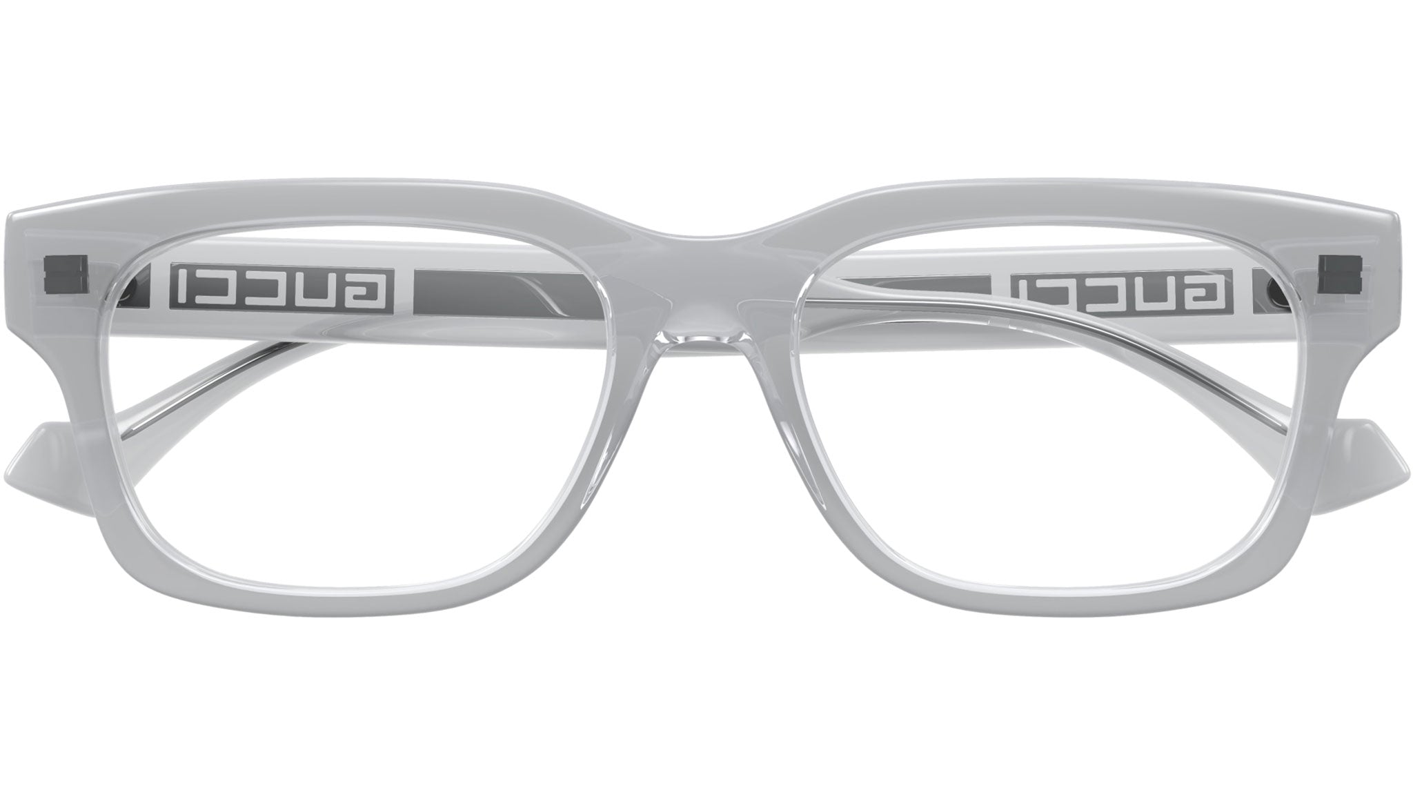 Occhiali da vista Gucci modello GG1731O linea Lettering in acetato riciclato forma rettangolare codice colore 003 grigio nuvola trasparente lucido con aste in grigio e lenti demo. Rivenditore autorizzato Gucci online. Gli occhiali vengono consegnati con custodia e accessori originali e sono coperti dalla garanzia ufficiale di 12 mesi del produttore.