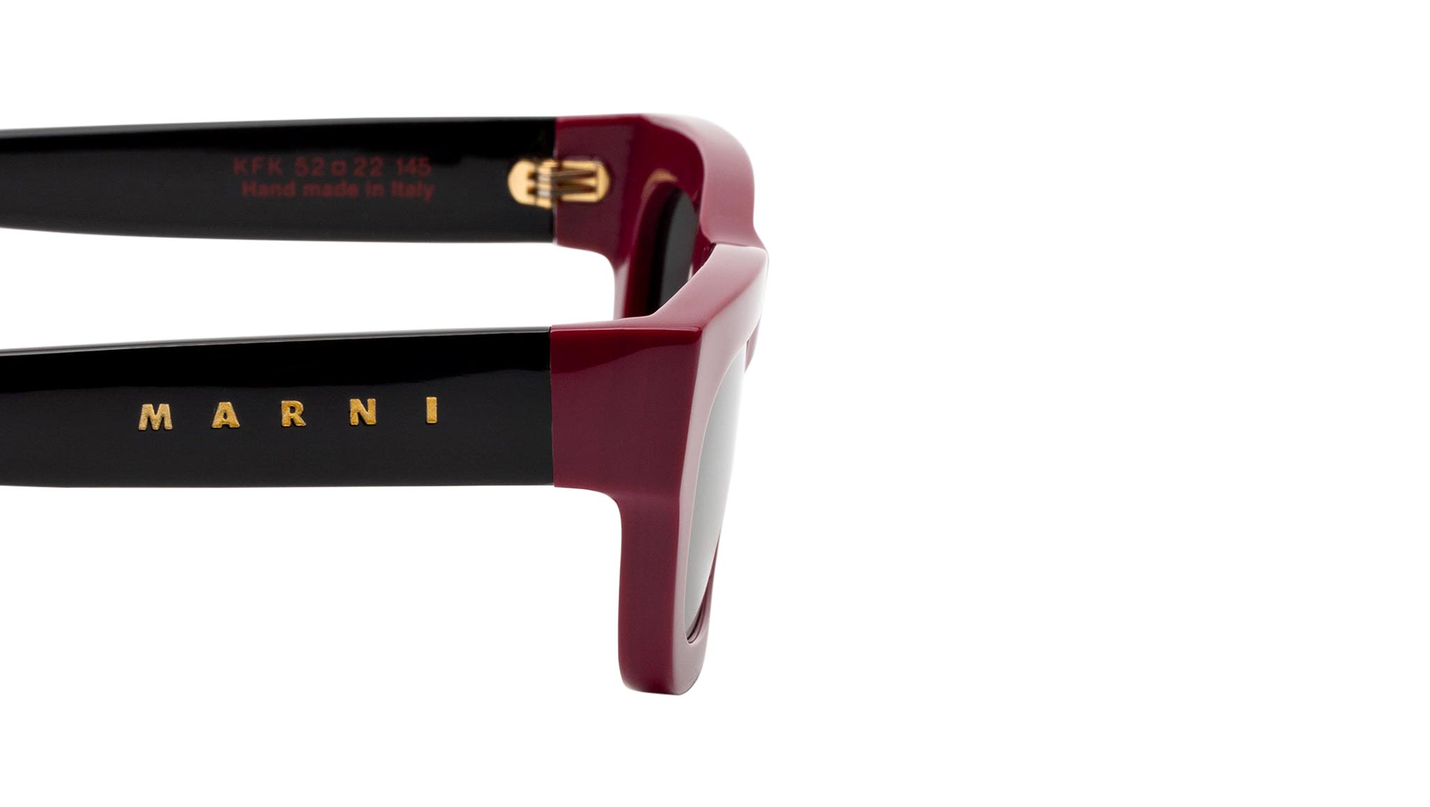 Kawasan Falls was conceived as an everyday essential silhouette, yet with a unique twist. True to Marni’s identity that celebrates quirky personal style, individualism and originality, these squared glasses feature unexpected detailing. Its straight, geometric temples are wide and sturdy to match its thick front, with a prominent nose bridge and angular rims. This version comes in a burgundy finish with black lenses. Sizes: R Lens Width: 52 mm. Frame Front: Frame Side: 145 mm. Product Code Size R: KFK