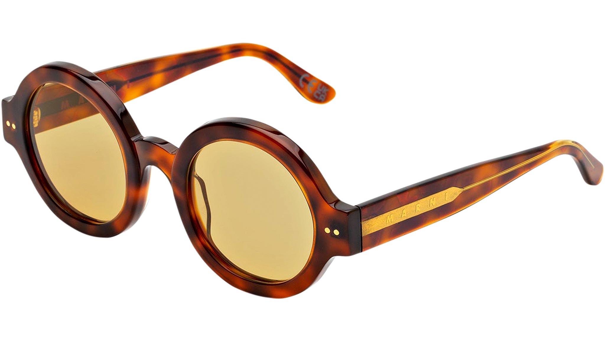 Designed exclusively for Marni, Nakagin Tower is a playful silhouette that praises the historical round shape. The model features rounded lenses encased within thick rims with a curved nose-bridge and sturdy temples. A modernist icon revisited for a fresher, more contemporary aesthetics. This version is available in a warm Havana acetate with mustard tinted lenses. Sizes: R Lens Width: 50 mm. Frame Front: Frame Side: 145 mm. Product Code Size R: VQA