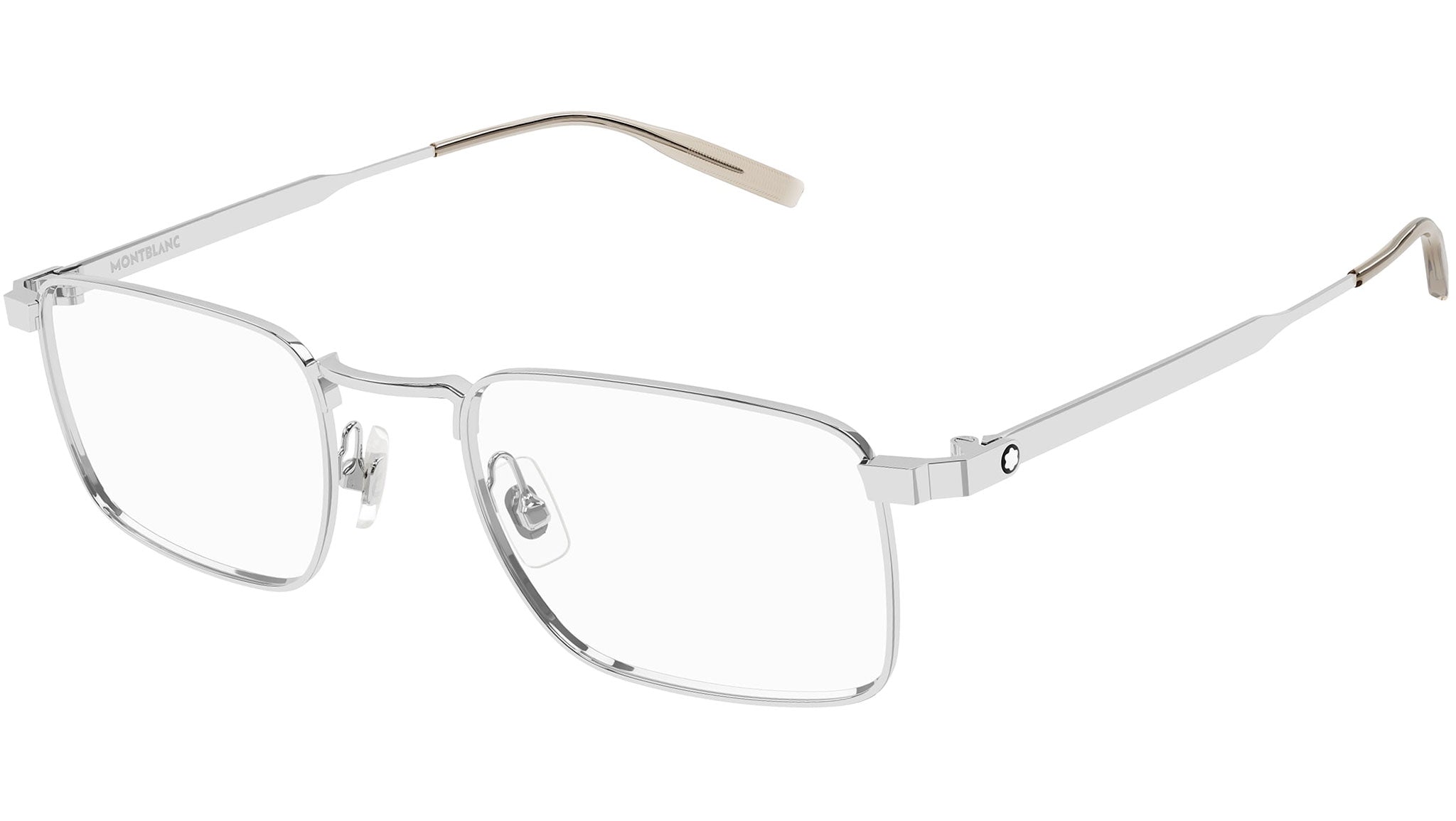 Occhiali da vista Montblanc linea Established modello MB0231O variante colore 005 argento lucido con astine color lenti demo.