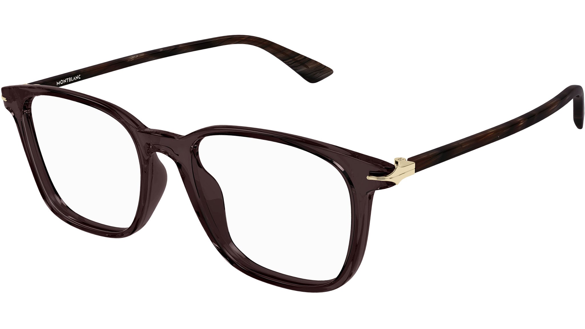 Occhiali da vista Montblanc Nib modello MB0338O in acetato riciclato rettangolare marrone tortora trasparente lucido con aste in marrone e lenti demo. Rivenditore autorizzato Montblanc online. Gli occhiali vengono consegnati con custodia e accessori originali e sono coperti dalla garanzia ufficiale di 12 mesi del produttore.