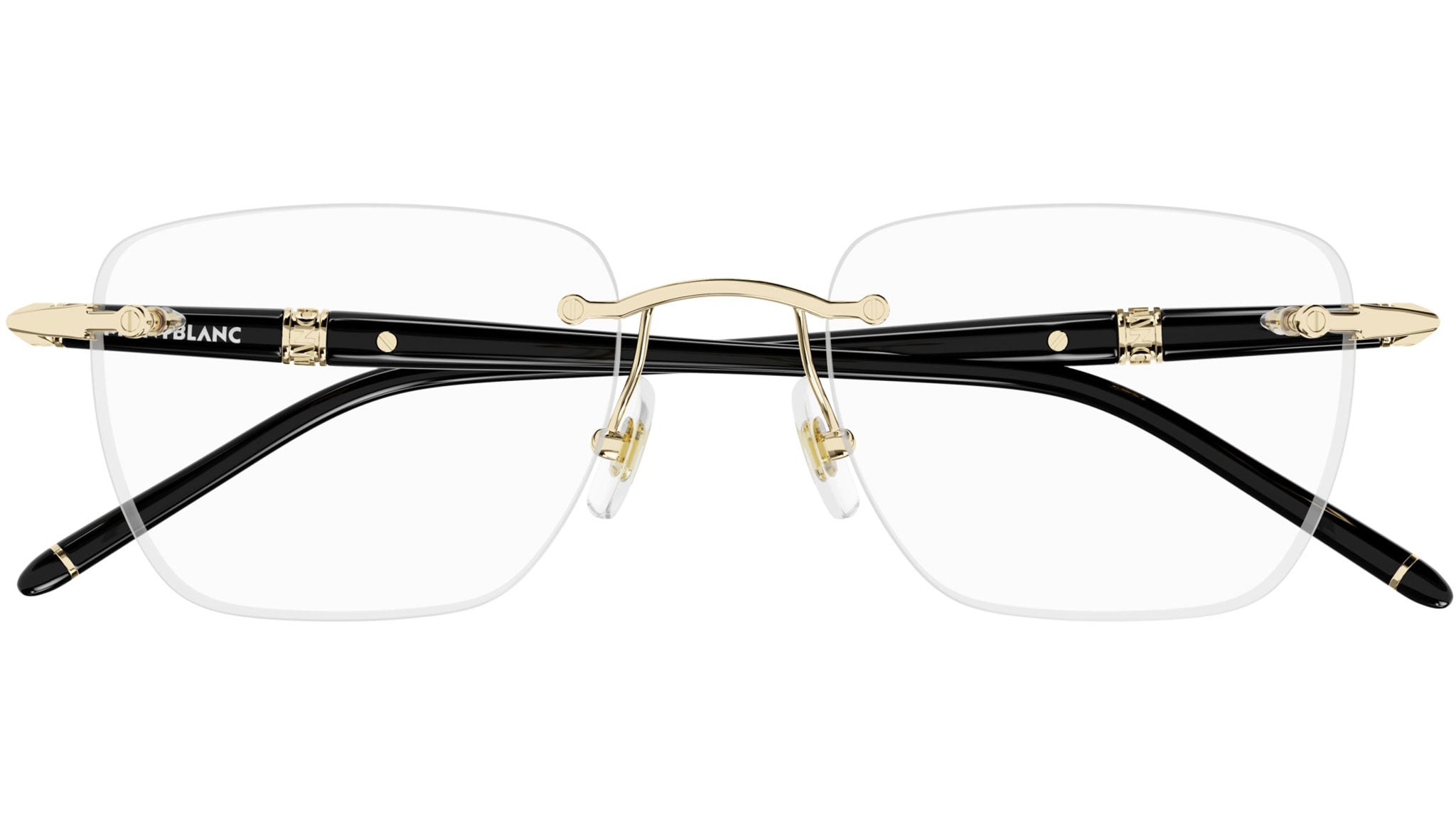 Occhiali da vista Montblanc modello MB0346O linea Meisterstück forma rettangolare in metallo, codice colore 001 oro chiaro lucido con aste color nero e lenti demo.