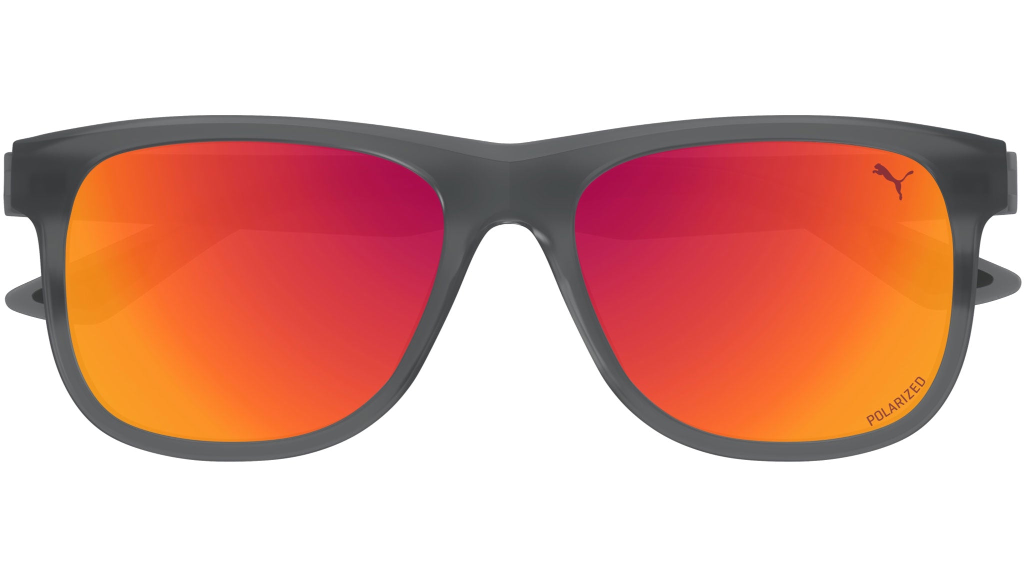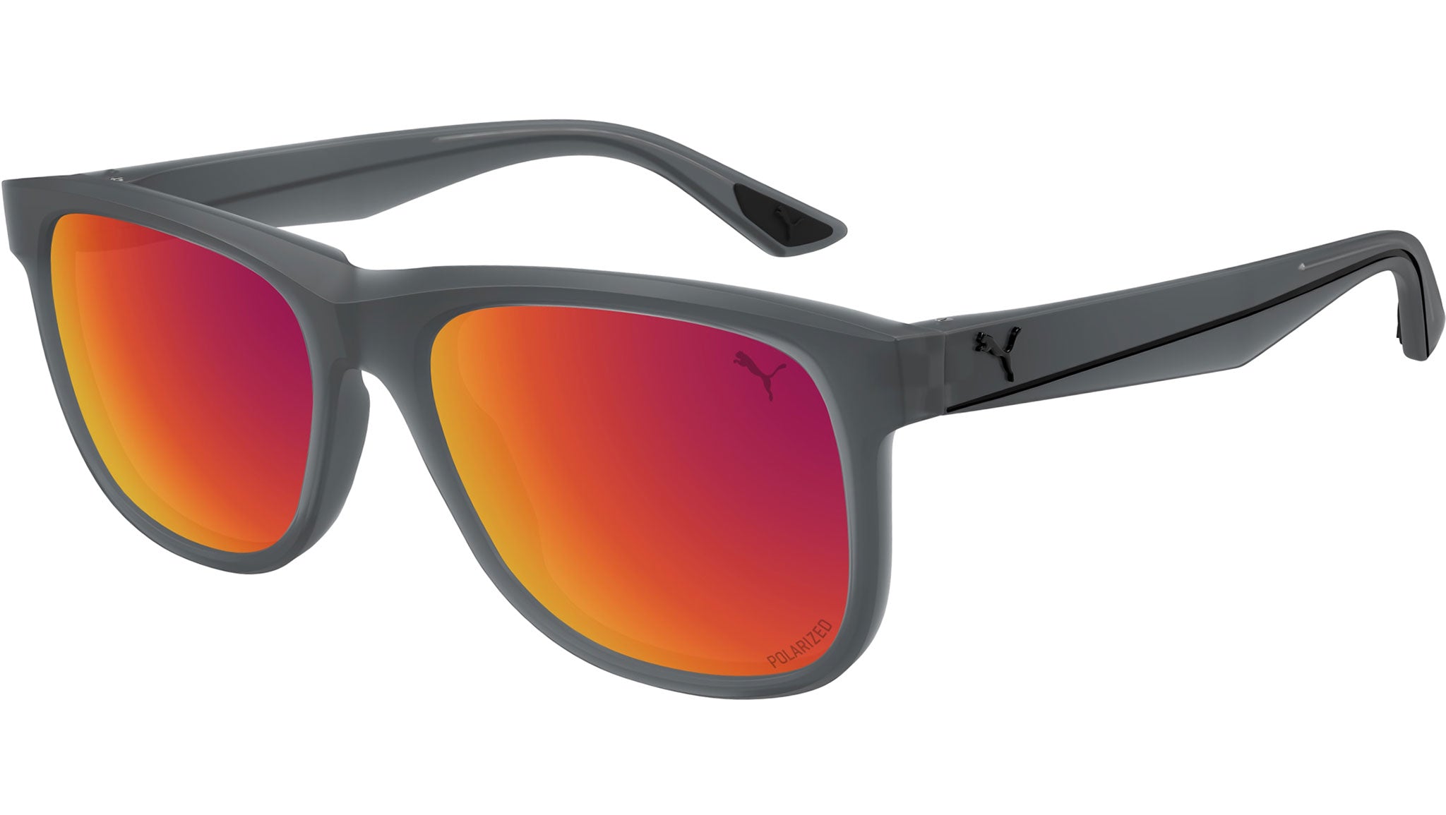 Occhiali da sole Puma Sport modello PU0442S variante colore 005 grigio scuro opaco trasparente con lenti color grigio solido a specchio rosso. Rivenditore autorizzato Puma online. Gli occhiali vengono consegnati con custodia e accessori originali e sono coperti dalla garanzia ufficiale di 12 mesi del produttore.