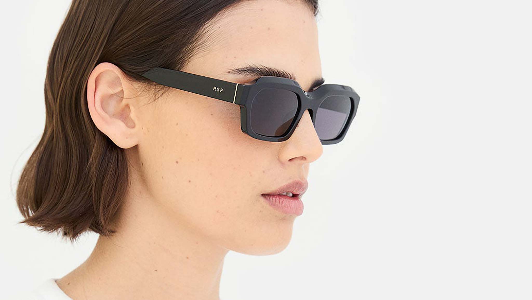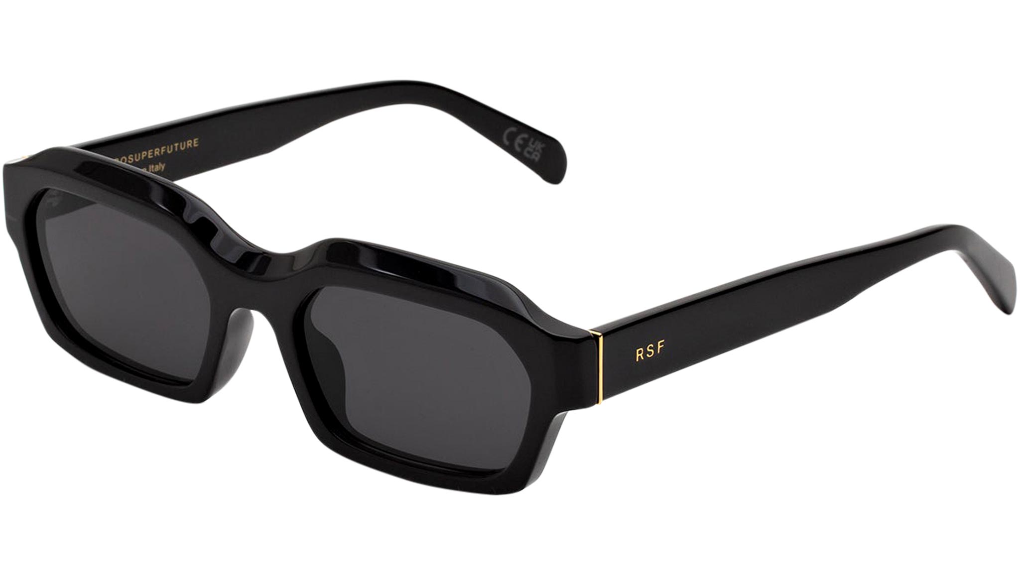 Boletus is a determined contemporary frame that highlights RSF’s unique approach to everyday design, with its singular shape, sturdy acetate construction and a low-riding silhouette. An original shape, Boletus features a hexagonal design with wide lenses and protruding temple tips. Amongst its key features is a thick brow-line, chiseled at an angle for a sculptural, three-dimensional highlight. A fresh everyday model created for modern audiences, this version of Boletus comes in black acetate with matching lenses. Sizes: R Lens Width: 56 mm. Frame Front: Frame Side: 145 mm. Product Code Size R: 03P