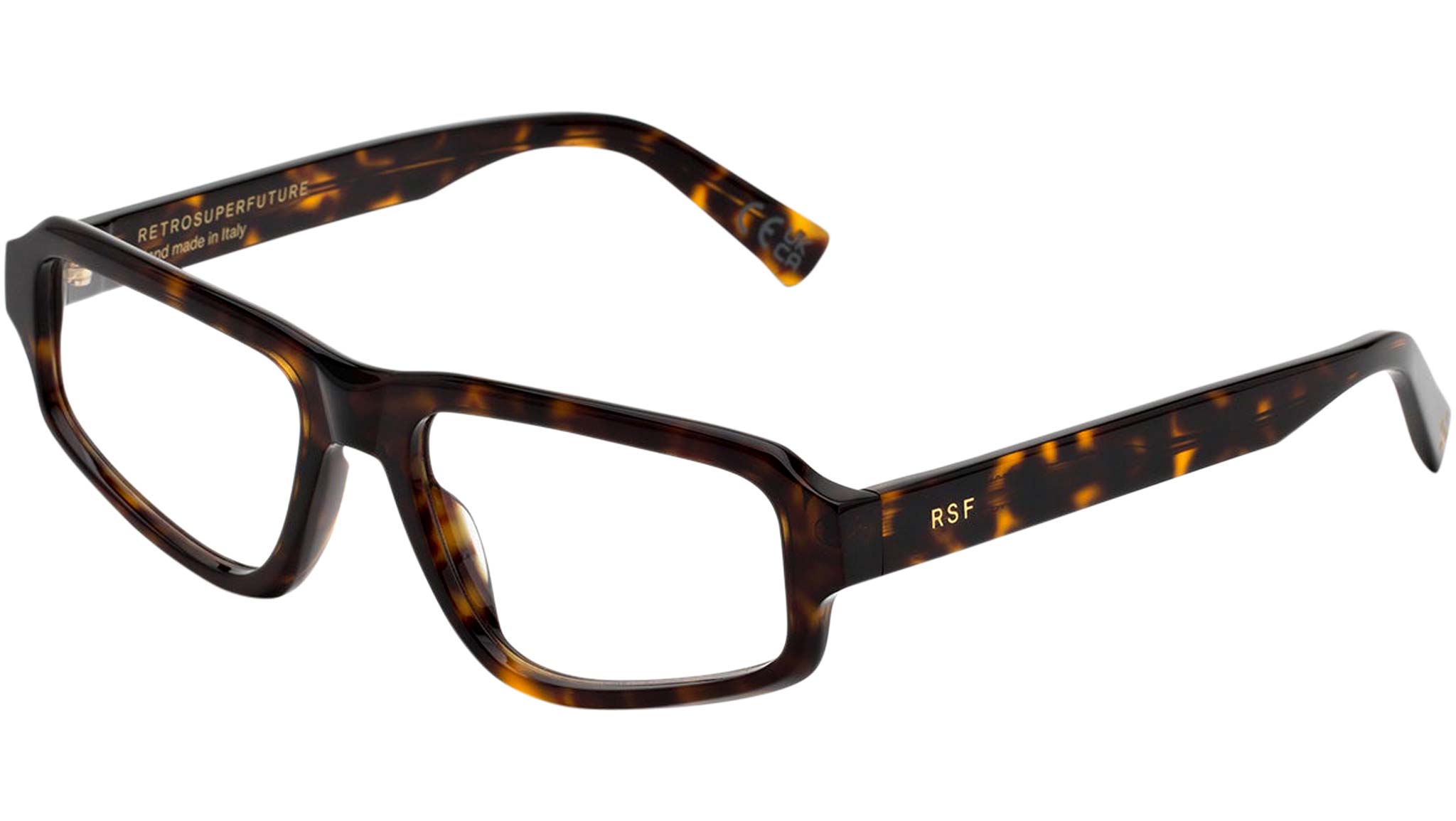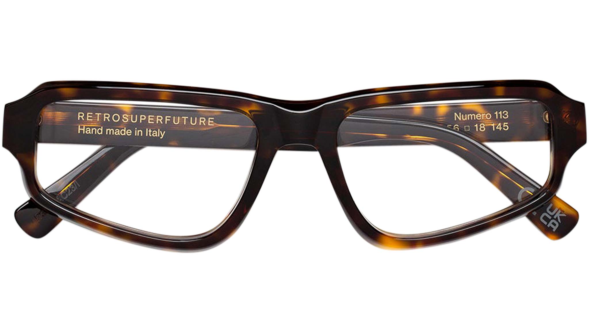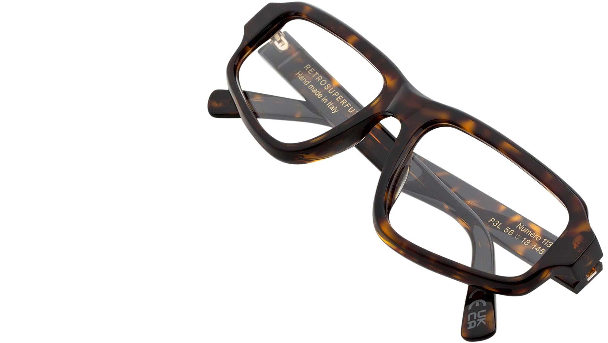 Numero 113 by Retrosuperfuture is a bold Optical frame that oozes with character. Inspired by streamlined, sportswear-style pieces, Numero 113 is designed as a compact mask, with a thick brow-line and slanted lenses. Chiselled acetate rims are shaped for lightness in everyday use, while adding an architectural quality to the frame. This version comes in a vibrant 3627 Havana acetate. Sizes: R Lens Width: 56 mm. Frame Front: Frame Side: 145 mm. Product Code Size R: P3L