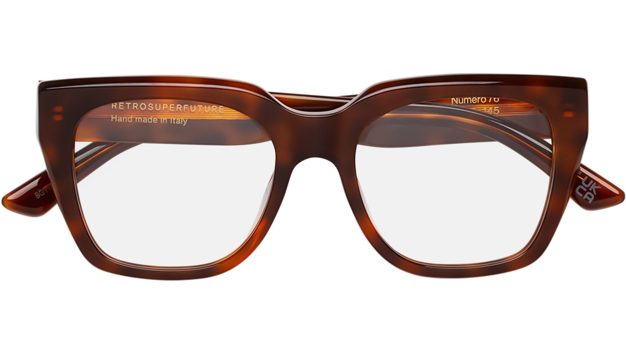 An everyday frame with a bold design, Numero 76 is an oversized silhouette interpreted with a contemporary aesthetic. The design features squared lenses and sleek acetate rims, carving on the frontal frame and around the edges to highlight its curves, decrease weight and ad extra comfort. This version comes in a vibrant Havana acetate. Prescription lenses not included. Sizes: R. Lens Width: 50 mm. Frame Front: Frame Side: 145 mm. Product Code Size R: 8GW.