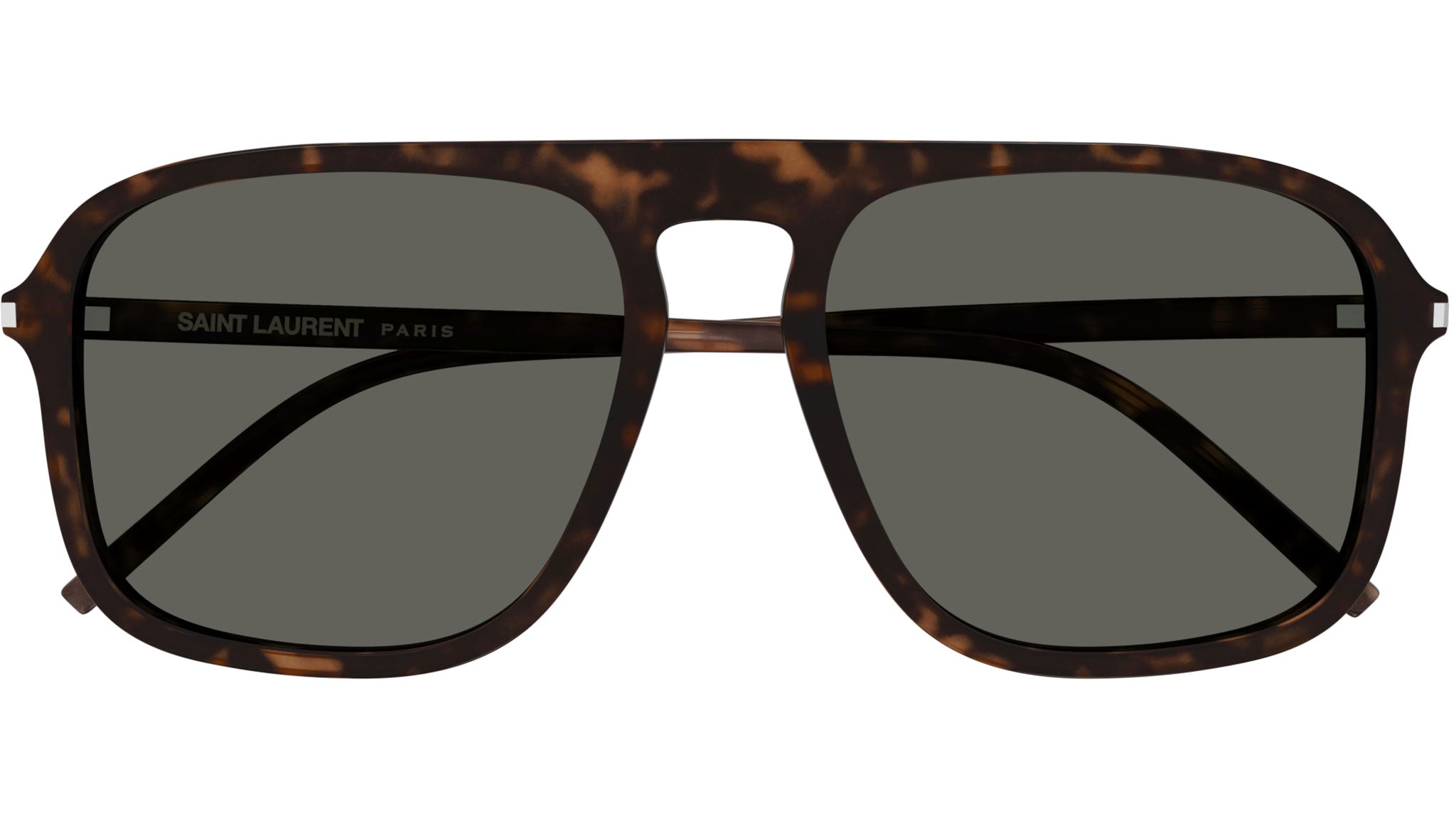 Occhiali da sole Saint Laurent modello SL 590 linea Classic codice colore 002 tartaruga scuro lucido in acetato riciclato forma rectangle con lenti color grigio tinta unita.