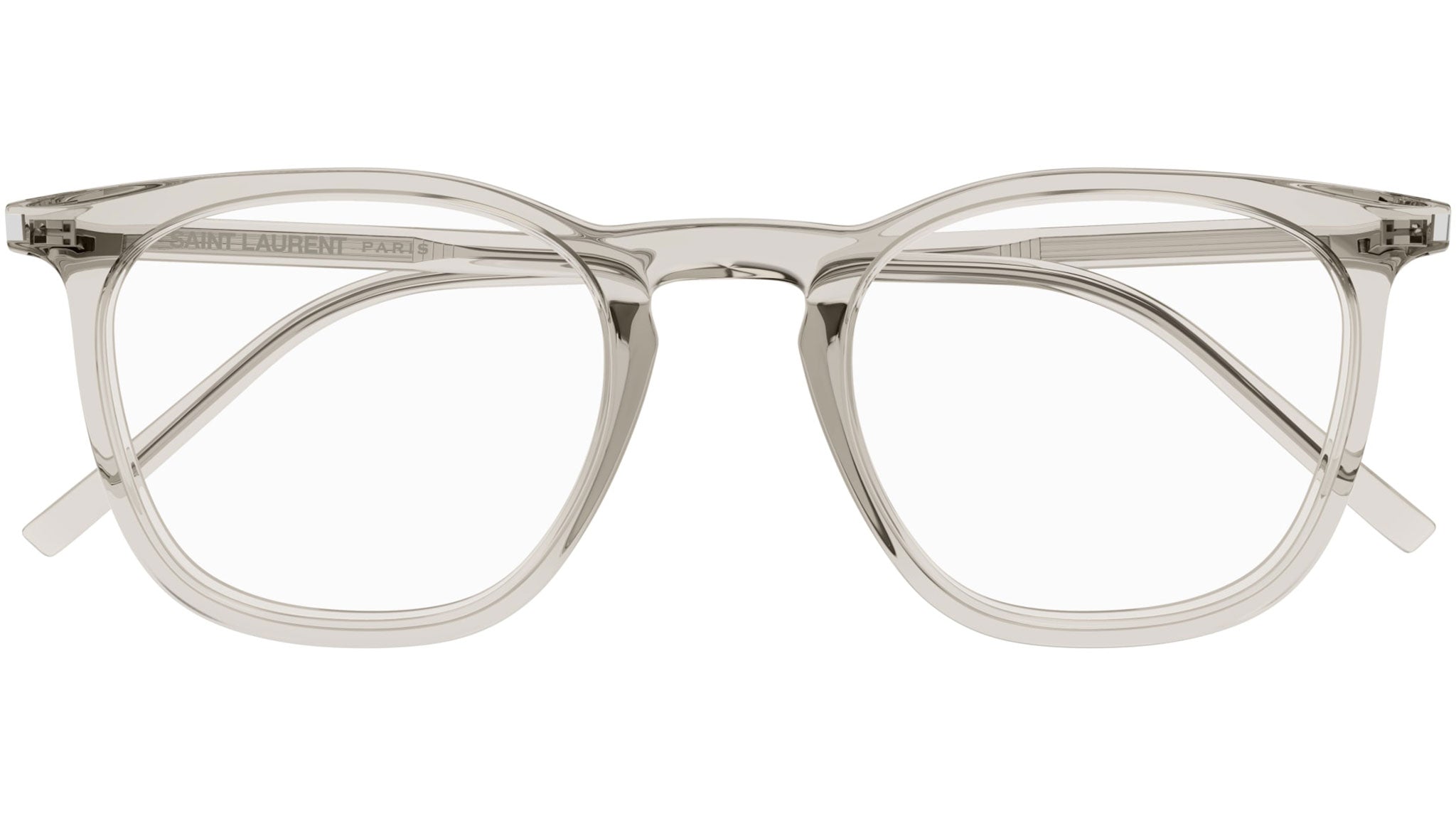 Occhiali da vista Saint Laurent modello SL 623 OPT linea New Wave codice colore 004 crema trasparente lucido in acetato riciclato forma panthos con aste color beige.