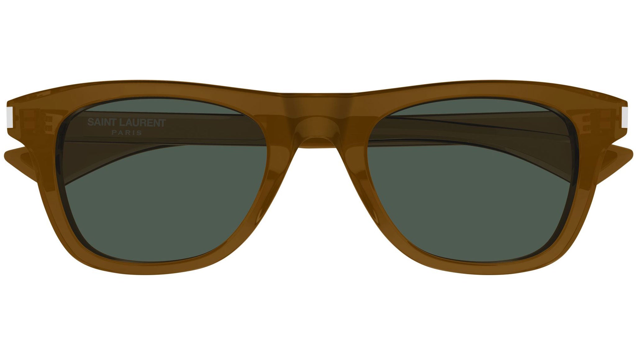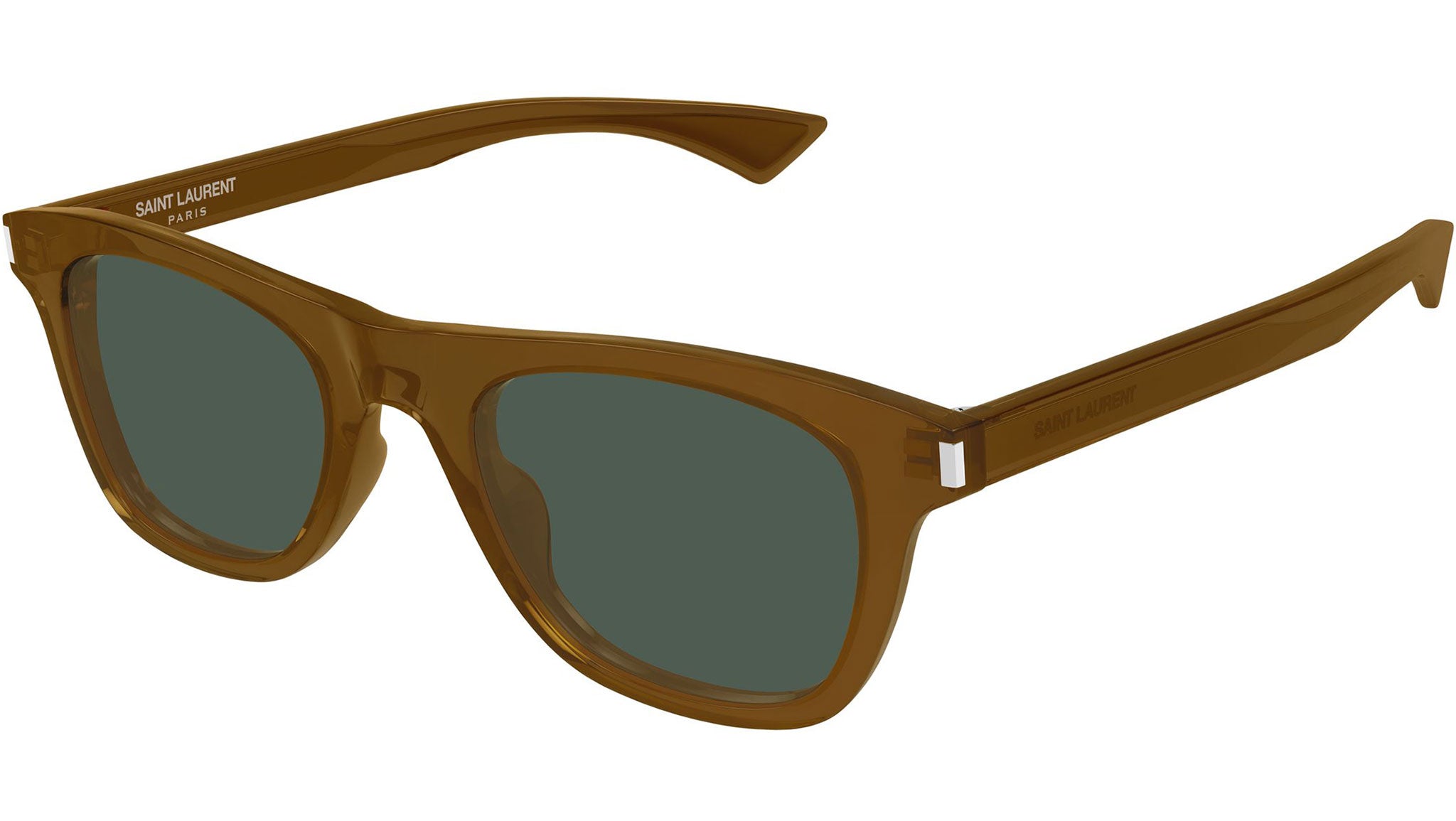 Occhiali da sole Saint Laurent SL 879 005 uomo con montatura rettangolare in acetato riciclato marrone cognac trasparente e lenti verde tinta unita. Linea: Corner Angle. Codice modello: SL 879. Codice colore: 005. Made in Japan. Rivenditore autorizzato Saint Laurent online. Gli occhiali vengono consegnati con custodia e accessori originali e sono coperti dalla garanzia ufficiale di 12 mesi del produttore.