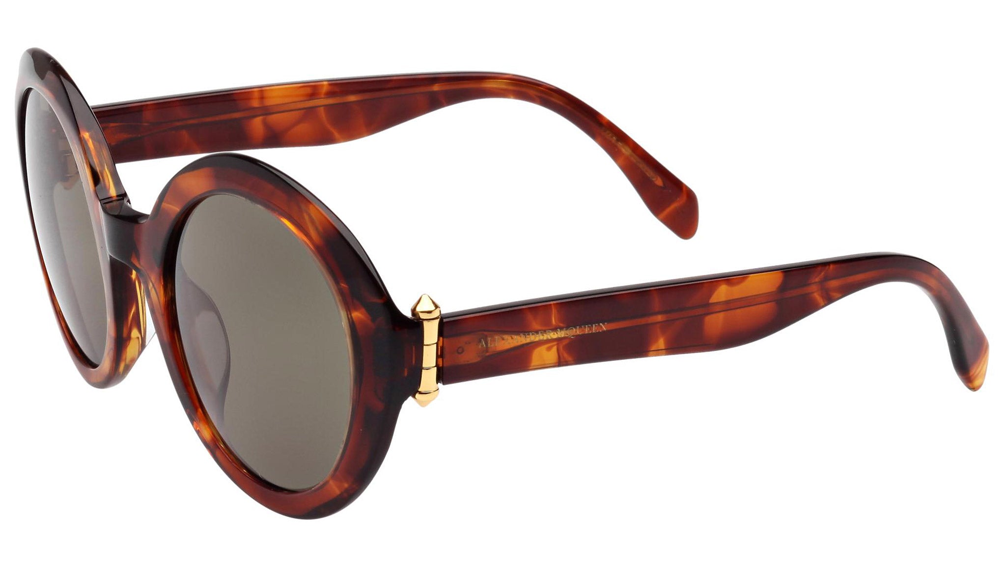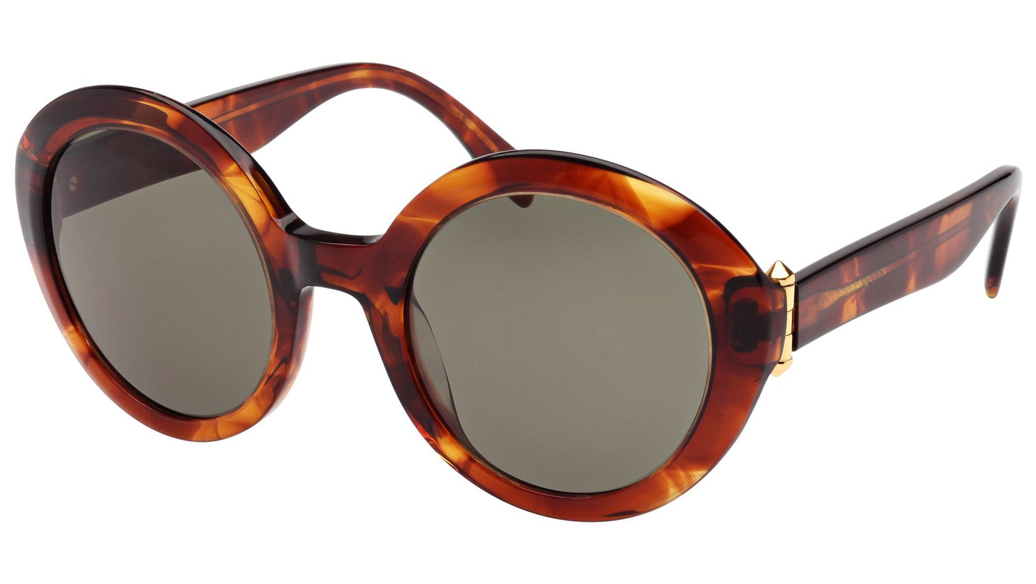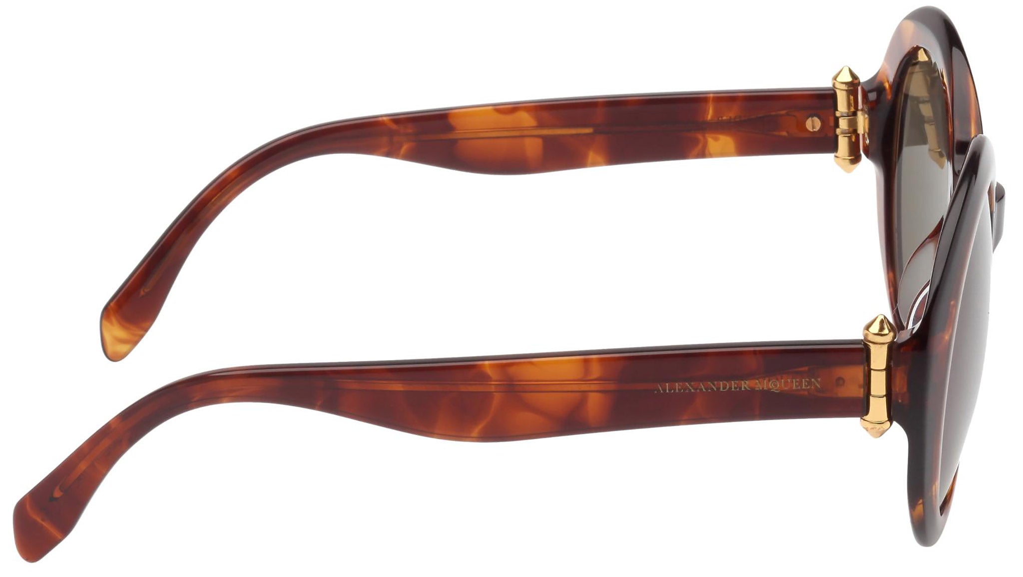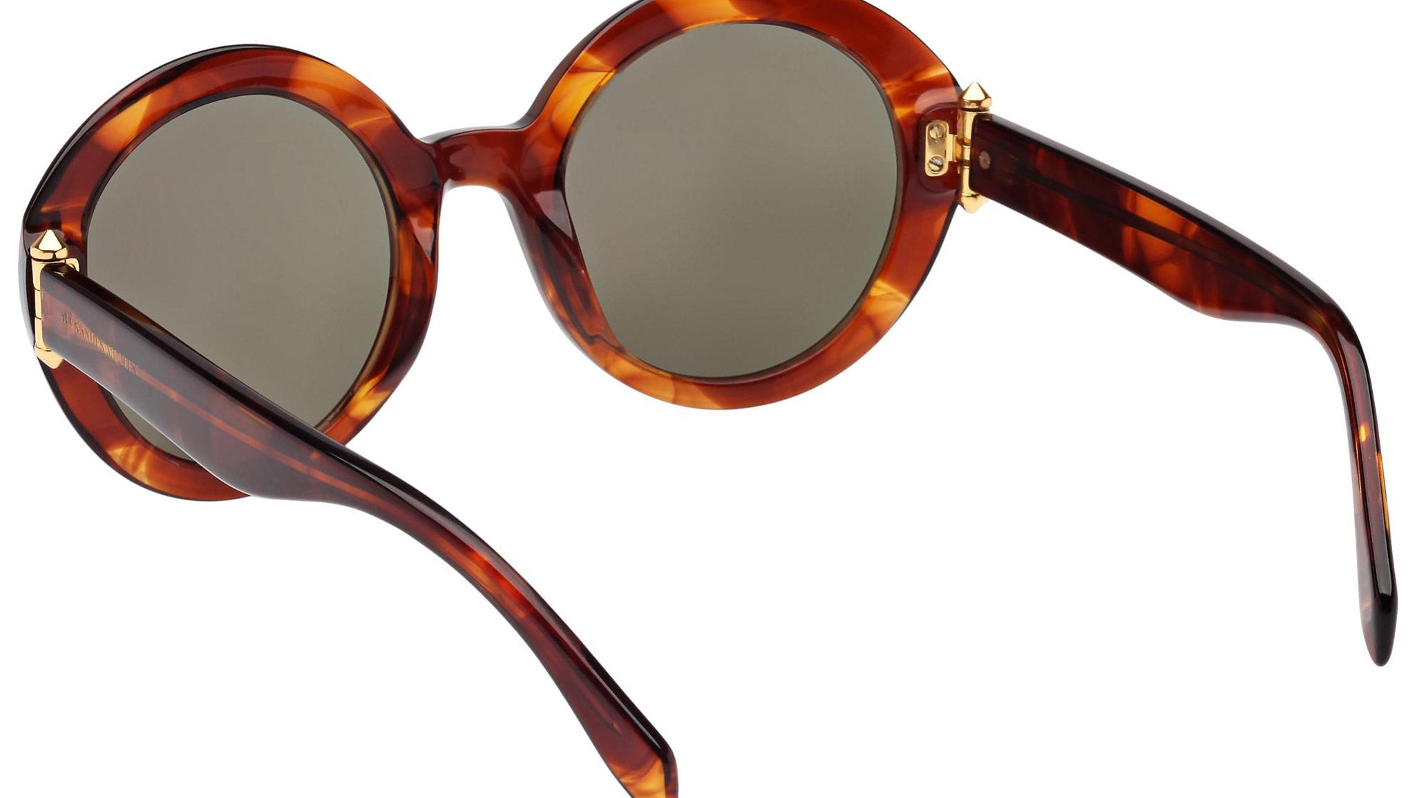 AM0002S 002 sunglasses by Alexander McQueen with striated havana (traveller) frame and solid green lenses. Alexander McQueen Eyewear eyewear styles represent a juxtaposition between contrasting elements: femininity and masculinity, fragility and strength, tradition and modernity. An innovative and uncompromising identity of the fashion house.