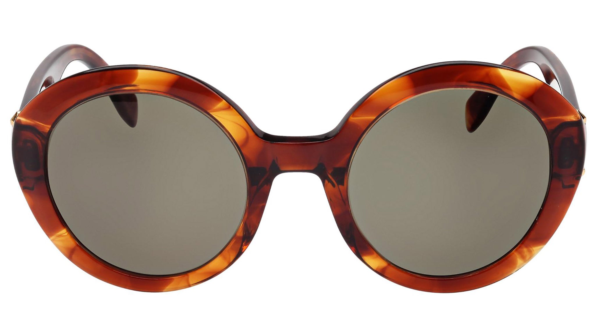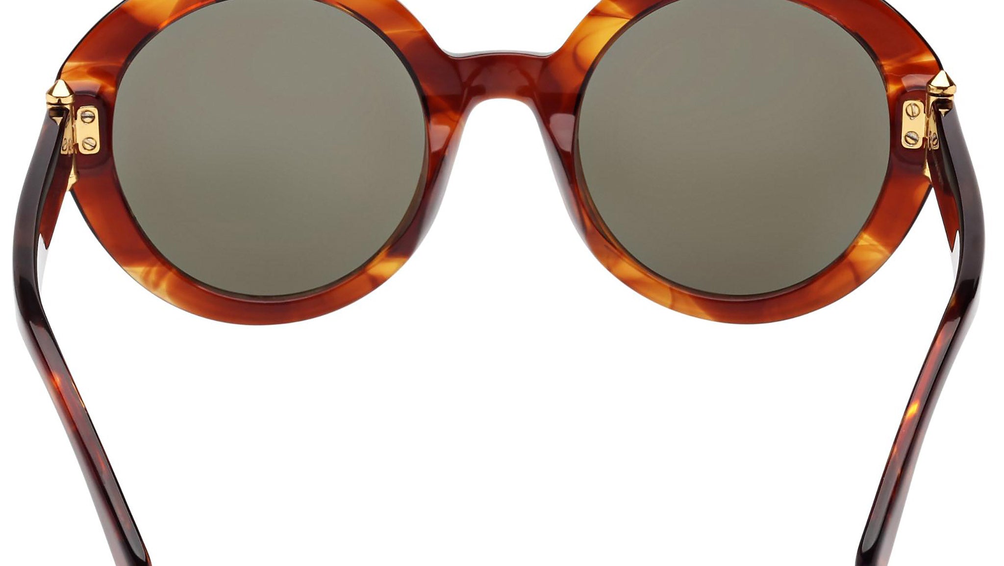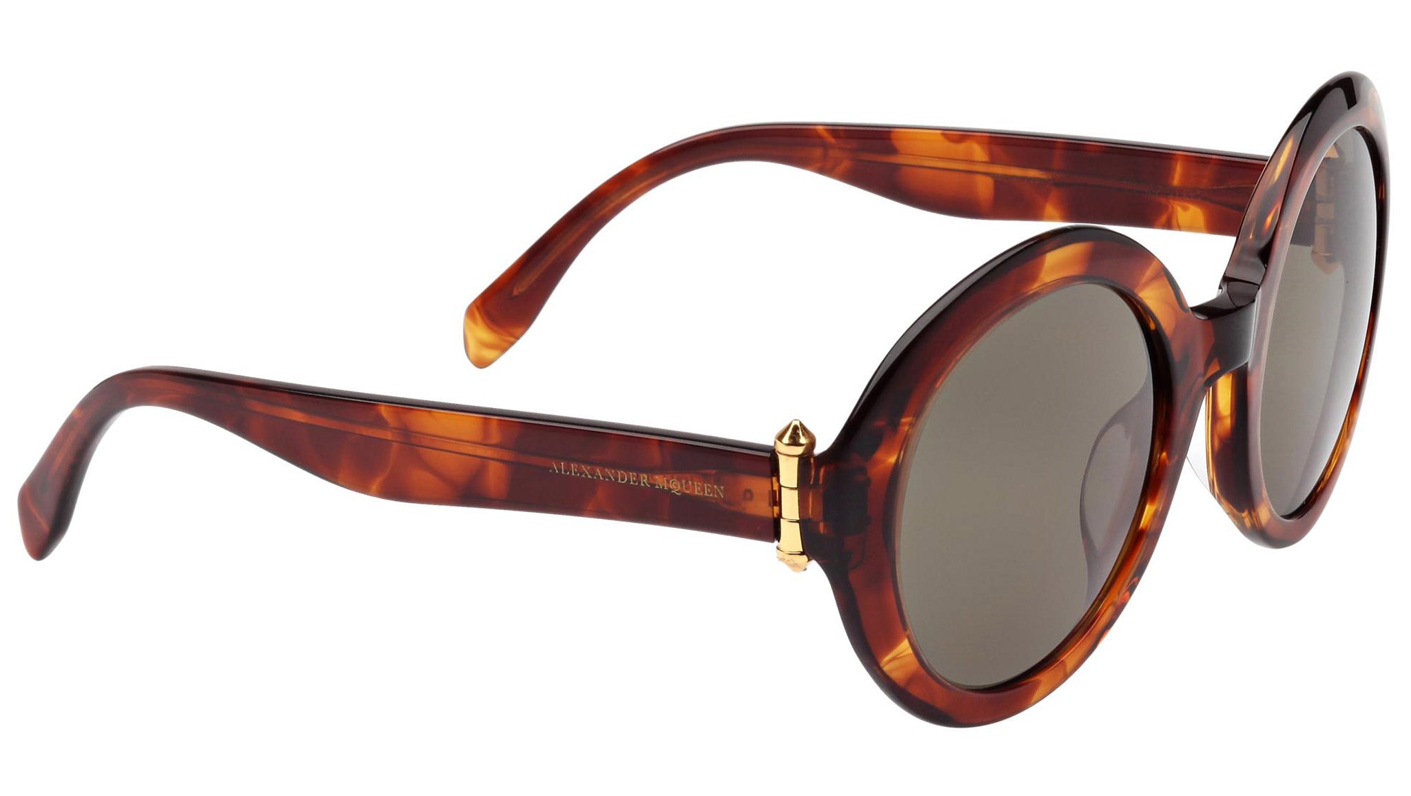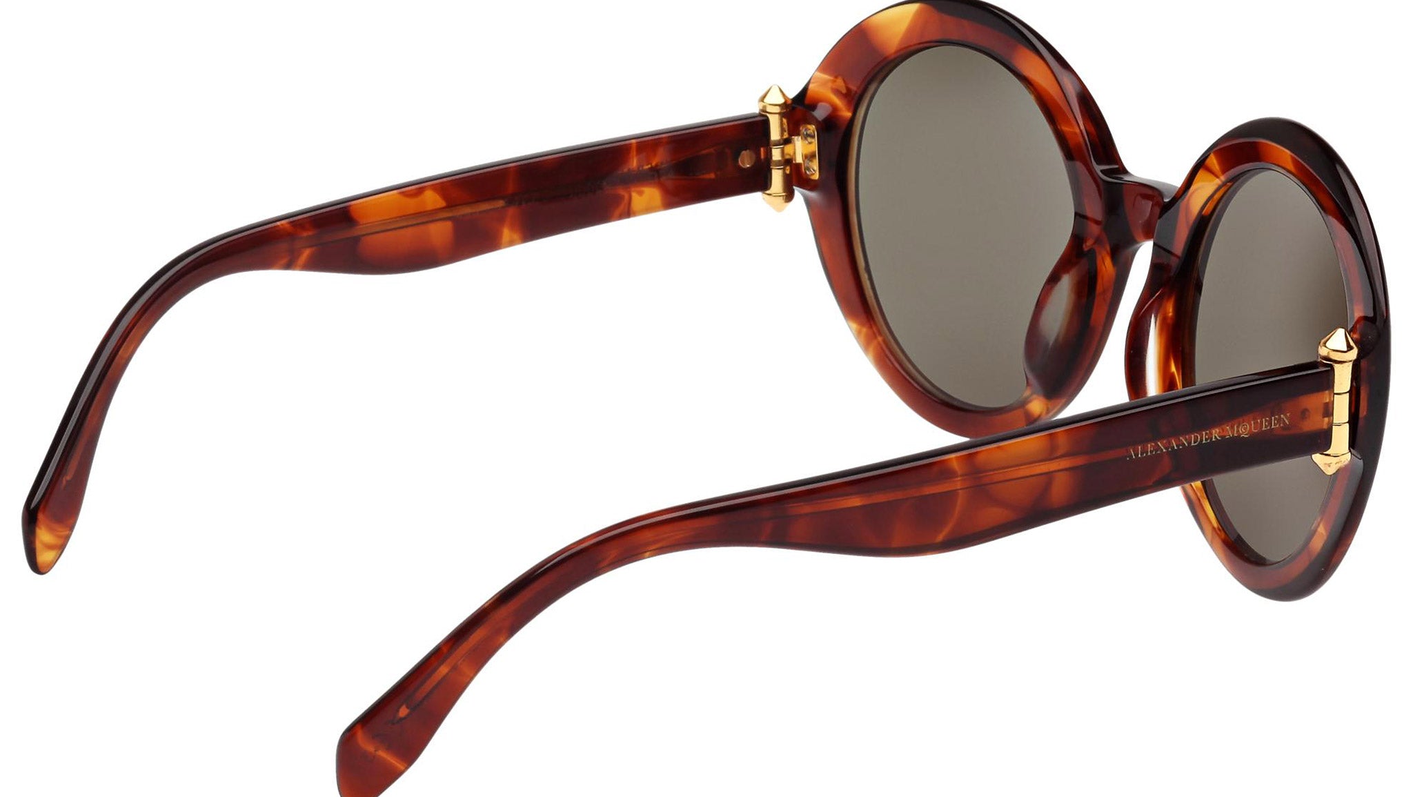 AM0002S 002 sunglasses by Alexander McQueen with striated havana (traveller) frame and solid green lenses. Alexander McQueen Eyewear eyewear styles represent a juxtaposition between contrasting elements: femininity and masculinity, fragility and strength, tradition and modernity. An innovative and uncompromising identity of the fashion house.