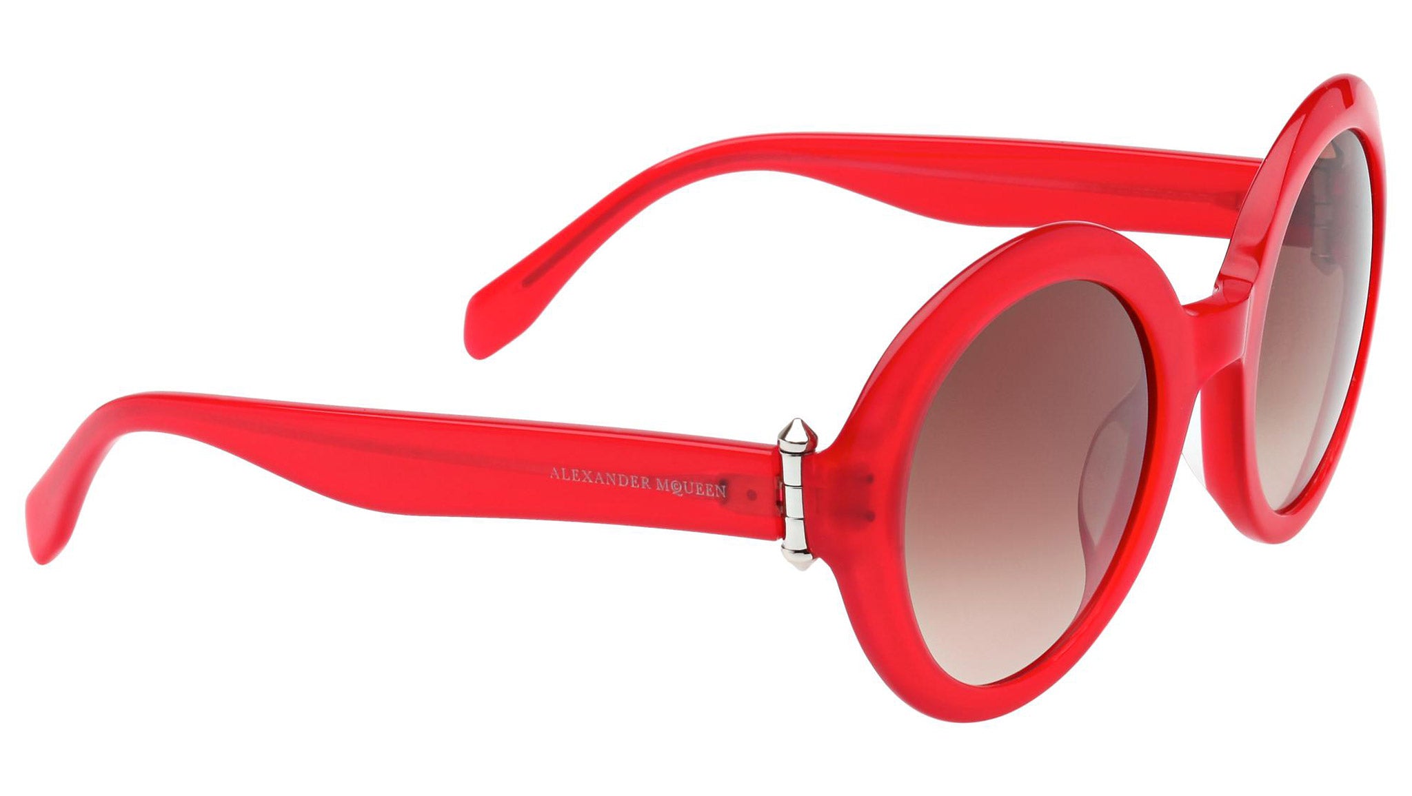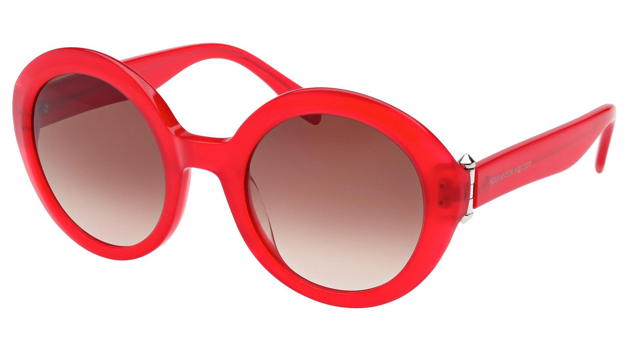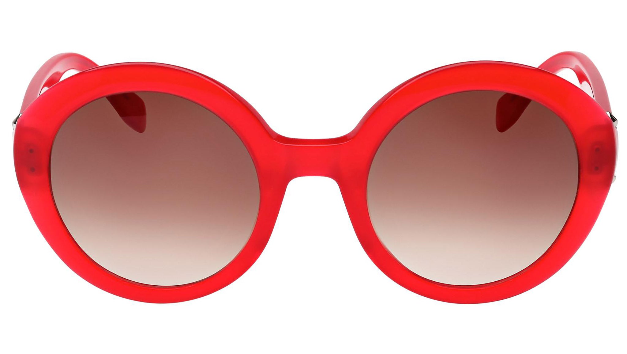 AM0002S 004 sunglasses by Alexander McQueen with opal red frame and gradient brown lenses. Alexander McQueen Eyewear eyewear styles represent a juxtaposition between contrasting elements: femininity and masculinity, fragility and strength, tradition and modernity. An innovative and uncompromising identity of the fashion house.