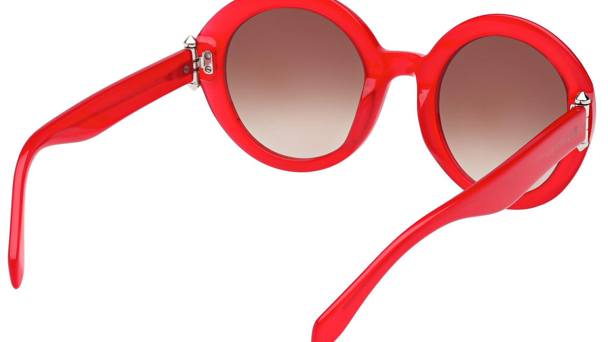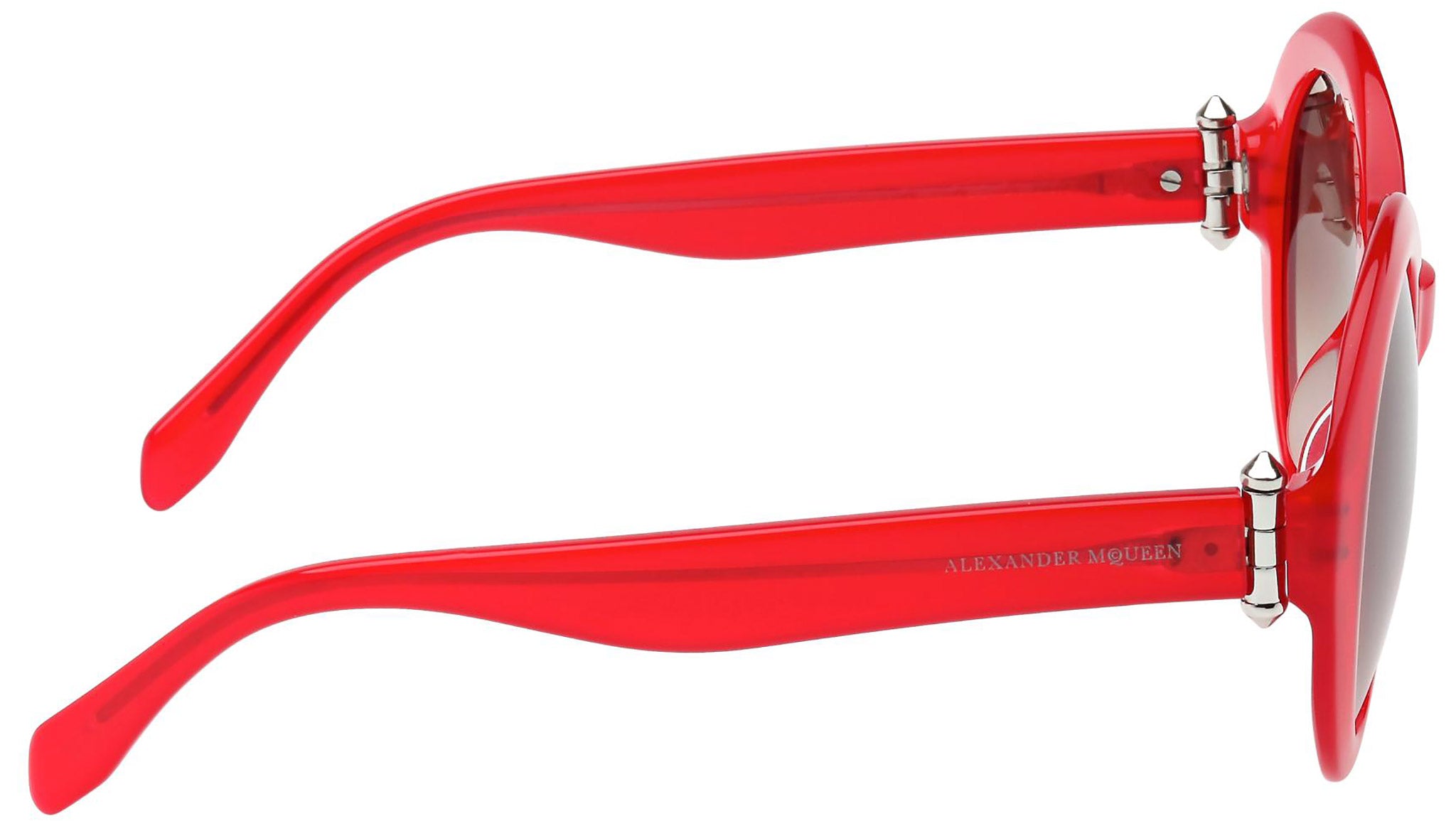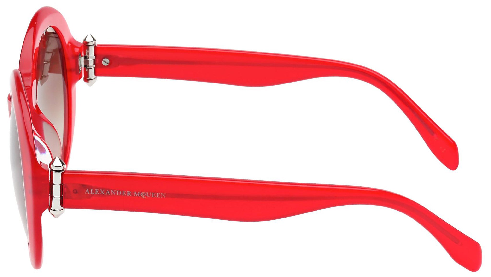 AM0002S 004 sunglasses by Alexander McQueen with opal red frame and gradient brown lenses. Alexander McQueen Eyewear eyewear styles represent a juxtaposition between contrasting elements: femininity and masculinity, fragility and strength, tradition and modernity. An innovative and uncompromising identity of the fashion house.