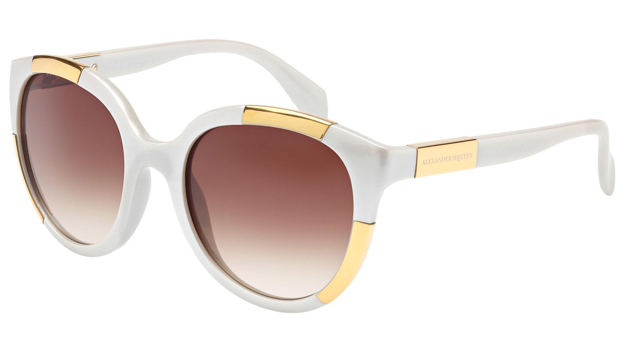 AM0007S 005 sunglasses by Alexander McQueen with white pearl frame and gradient brown lenses. Alexander McQueen Eyewear eyewear styles represent a juxtaposition between contrasting elements: femininity and masculinity, fragility and strength, tradition and modernity. An innovative and uncompromising identity of the fashion house.