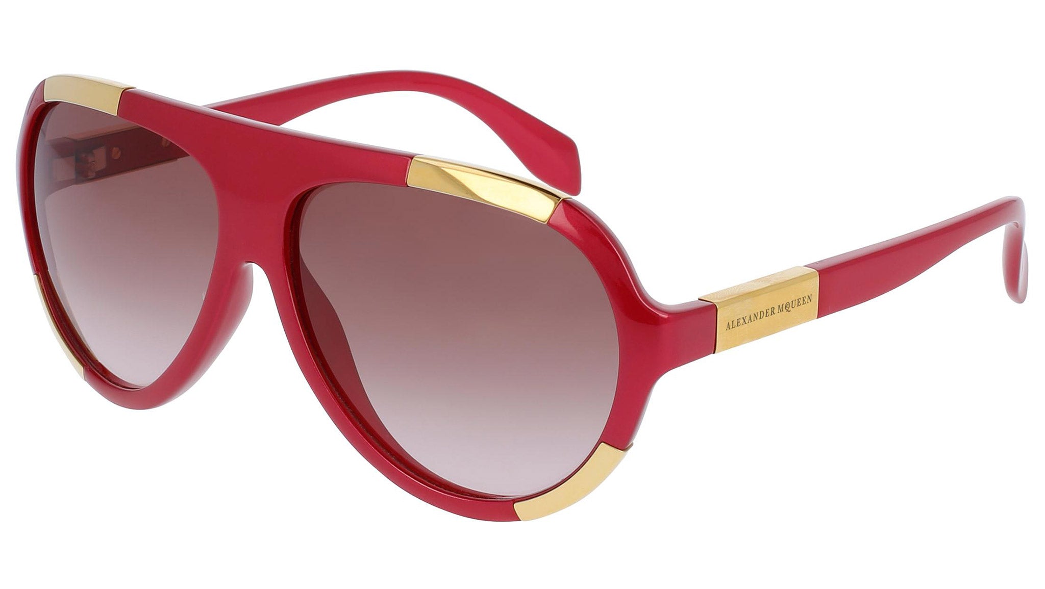 AM0008S 004 sunglasses by Alexander McQueen with cherry pearl frame and lenses. Alexander McQueen Eyewear eyewear styles represent a juxtaposition between contrasting elements: femininity and masculinity, fragility and strength, tradition and modernity. An innovative and uncompromising identity of the fashion house.