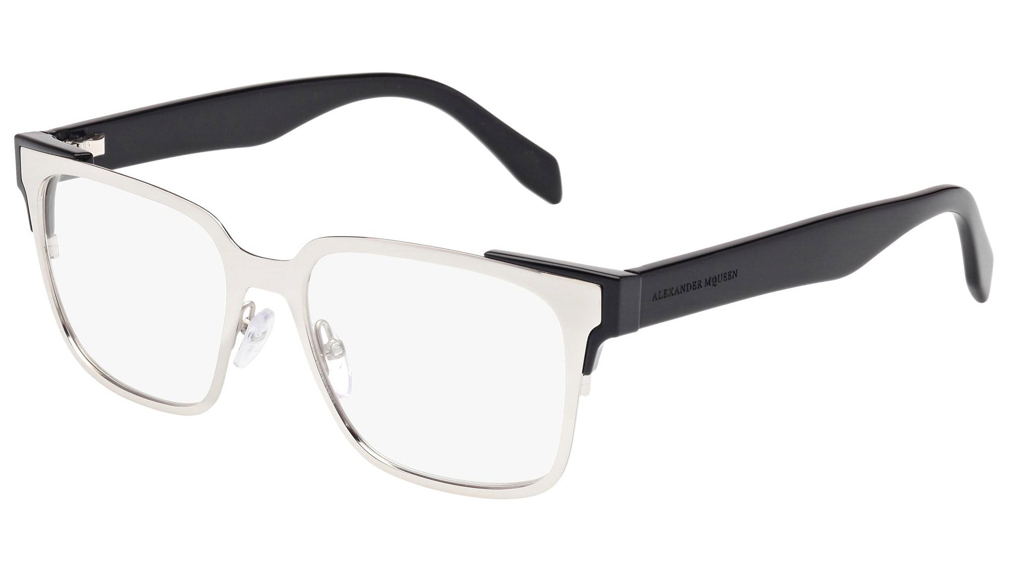 Alexander McQueen optical glasses model AM0014O 003 featuring shiny silver frame and black colour temple. Synonymous with fearless fashion, Alexander McQueen Eyewear eyewear styles represent a juxtaposition between contrasting elements, as his runway styles are unique and inspiring.