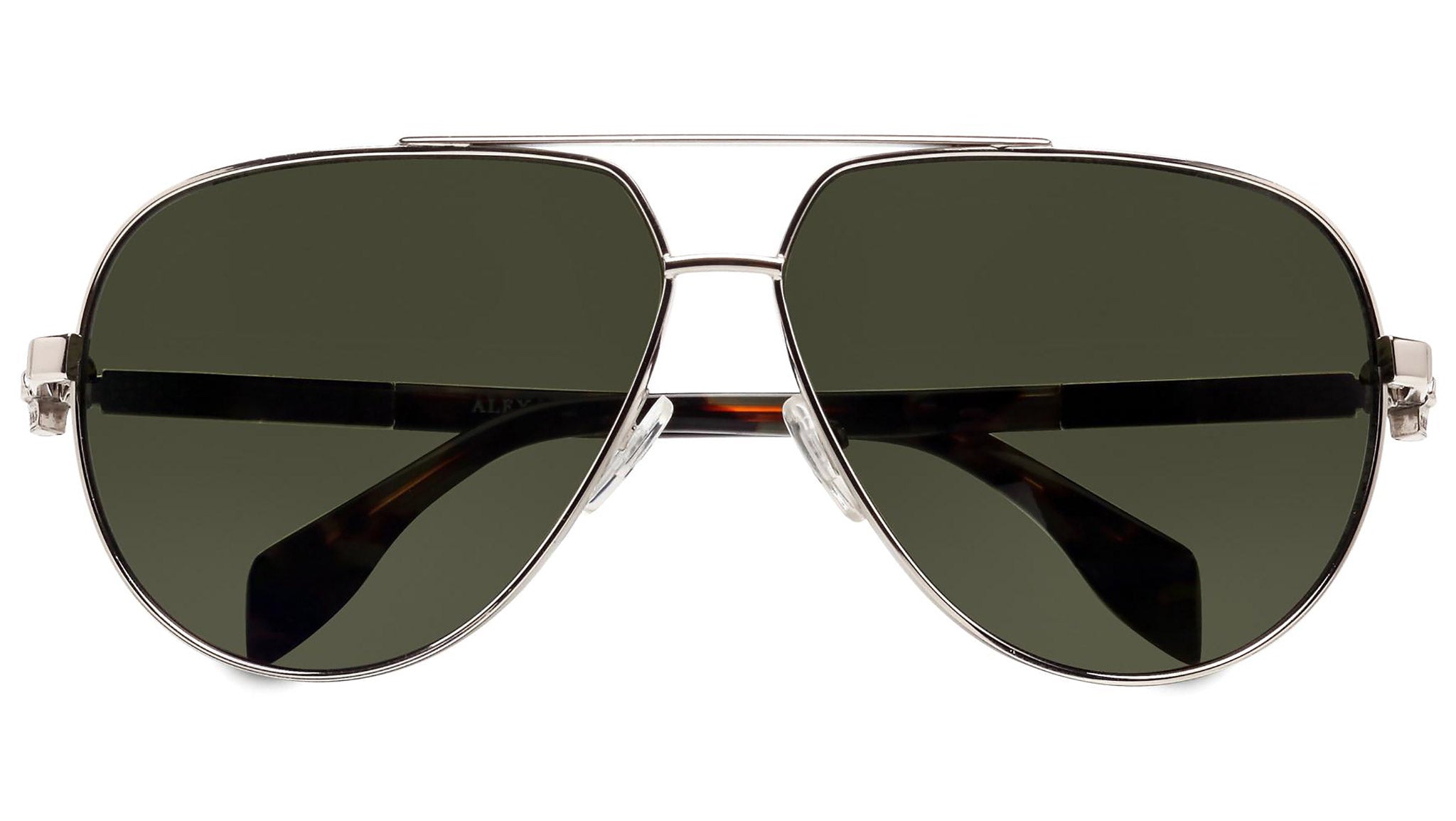 AM0018S 003 sunglasses by Alexander McQueen with shiny silver frame and solid green lenses. Alexander McQueen Eyewear eyewear styles represent a juxtaposition between contrasting elements: femininity and masculinity, fragility and strength, tradition and modernity. An innovative and uncompromising identity of the fashion house.