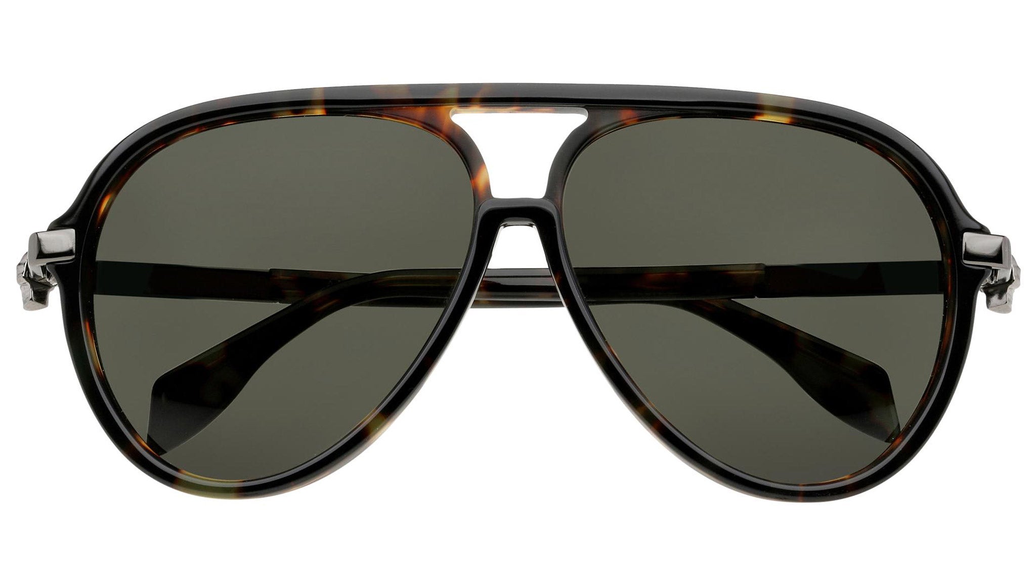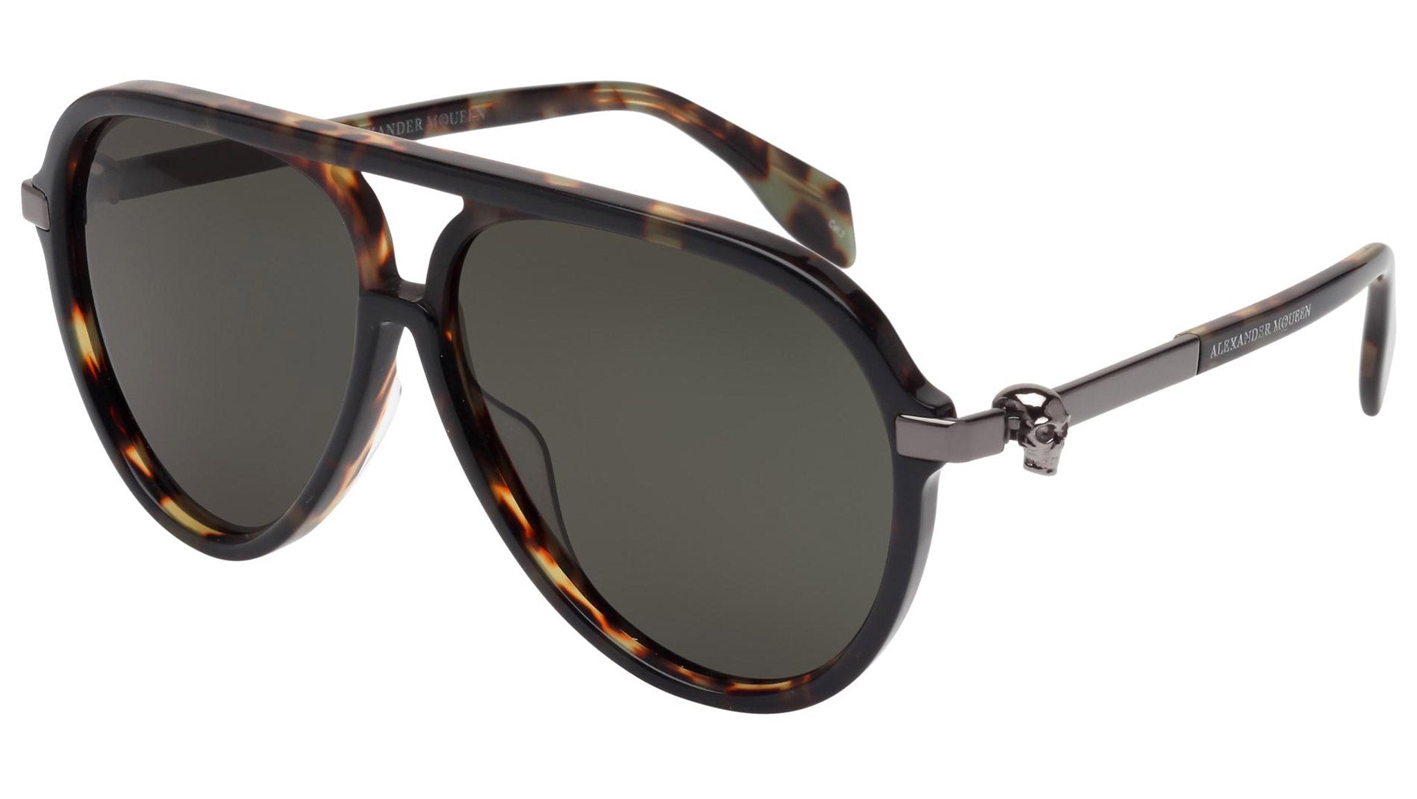 AM0020S 003 sunglasses by Alexander McQueen with olive havana frame and solid green lenses. Alexander McQueen Eyewear eyewear styles represent a juxtaposition between contrasting elements: femininity and masculinity, fragility and strength, tradition and modernity. An innovative and uncompromising identity of the fashion house.