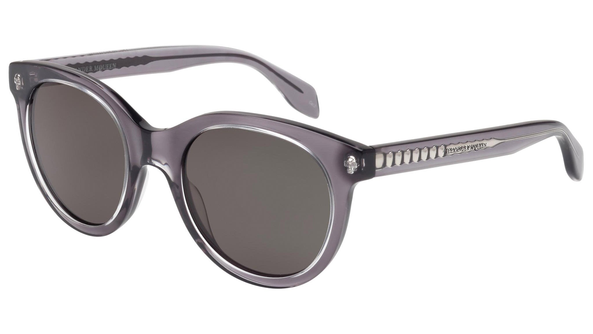 AM0024S 003 sunglasses by Alexander McQueen with crystal and transparent grey frame and solid green lenses. Alexander McQueen Eyewear eyewear styles represent a juxtaposition between contrasting elements: femininity and masculinity, fragility and strength, tradition and modernity. An innovative and uncompromising identity of the fashion house.