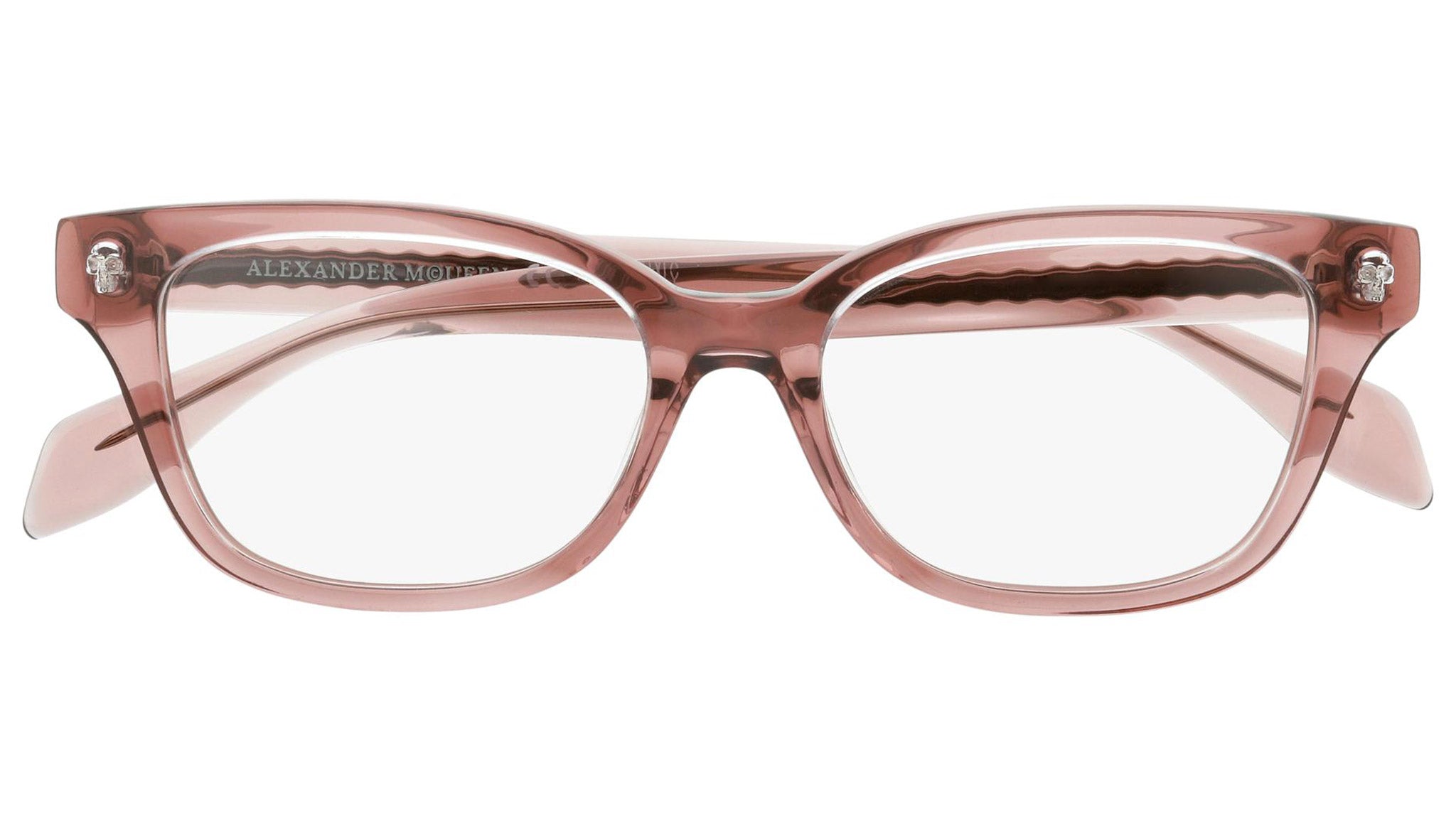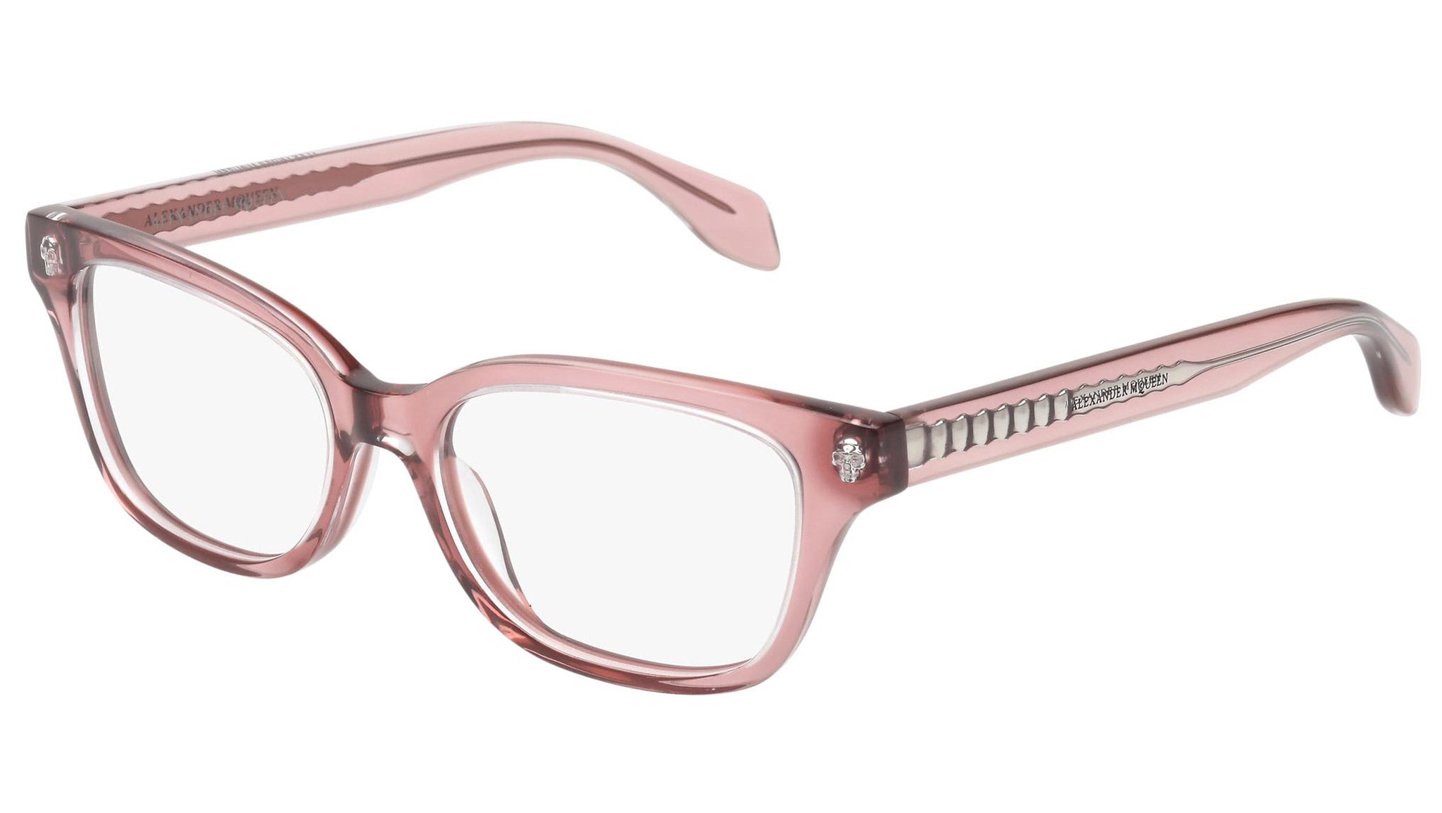 Alexander McQueen optical glasses model AM0026O 004 featuring crystal and rose frame and pink colour temple. Synonymous with fearless fashion, Alexander McQueen Eyewear eyewear styles represent a juxtaposition between contrasting elements, as his runway styles are unique and inspiring.