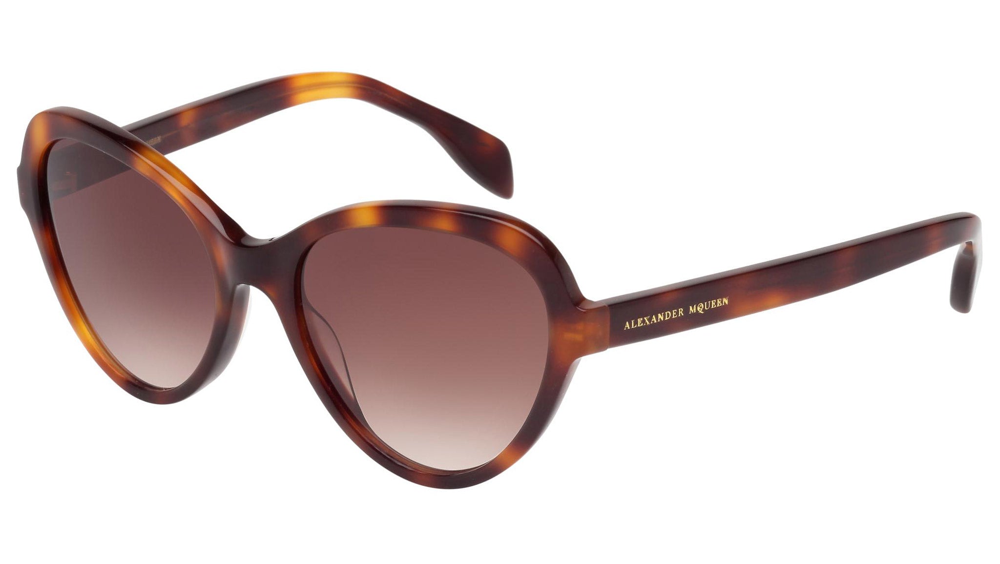 AM0029S 002 sunglasses by Alexander McQueen with shiny havana frame and gradient brown lenses. Alexander McQueen Eyewear eyewear styles represent a juxtaposition between contrasting elements: femininity and masculinity, fragility and strength, tradition and modernity. An innovative and uncompromising identity of the fashion house.