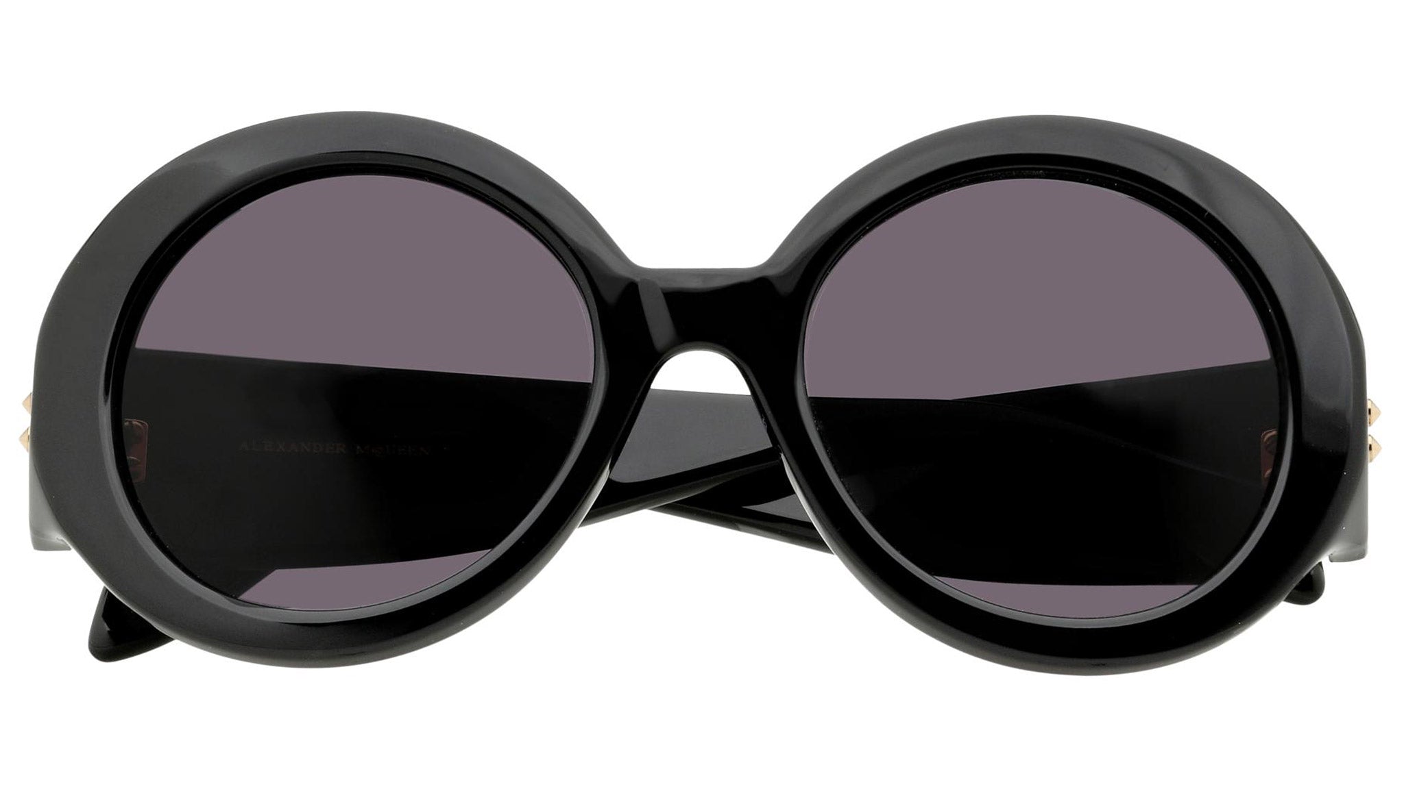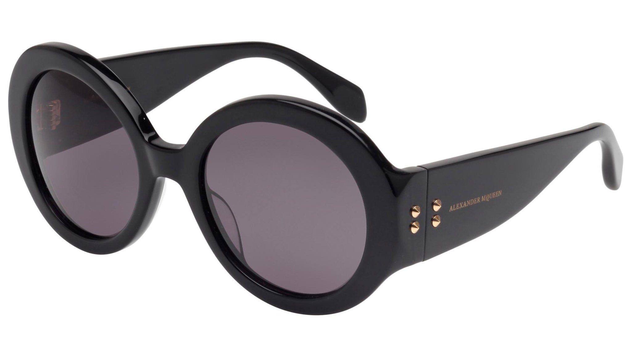 AM0032S 001 sunglasses by Alexander McQueen with shiny black frame and solid grey lenses. Alexander McQueen Eyewear eyewear styles represent a juxtaposition between contrasting elements: femininity and masculinity, fragility and strength, tradition and modernity. An innovative and uncompromising identity of the fashion house.