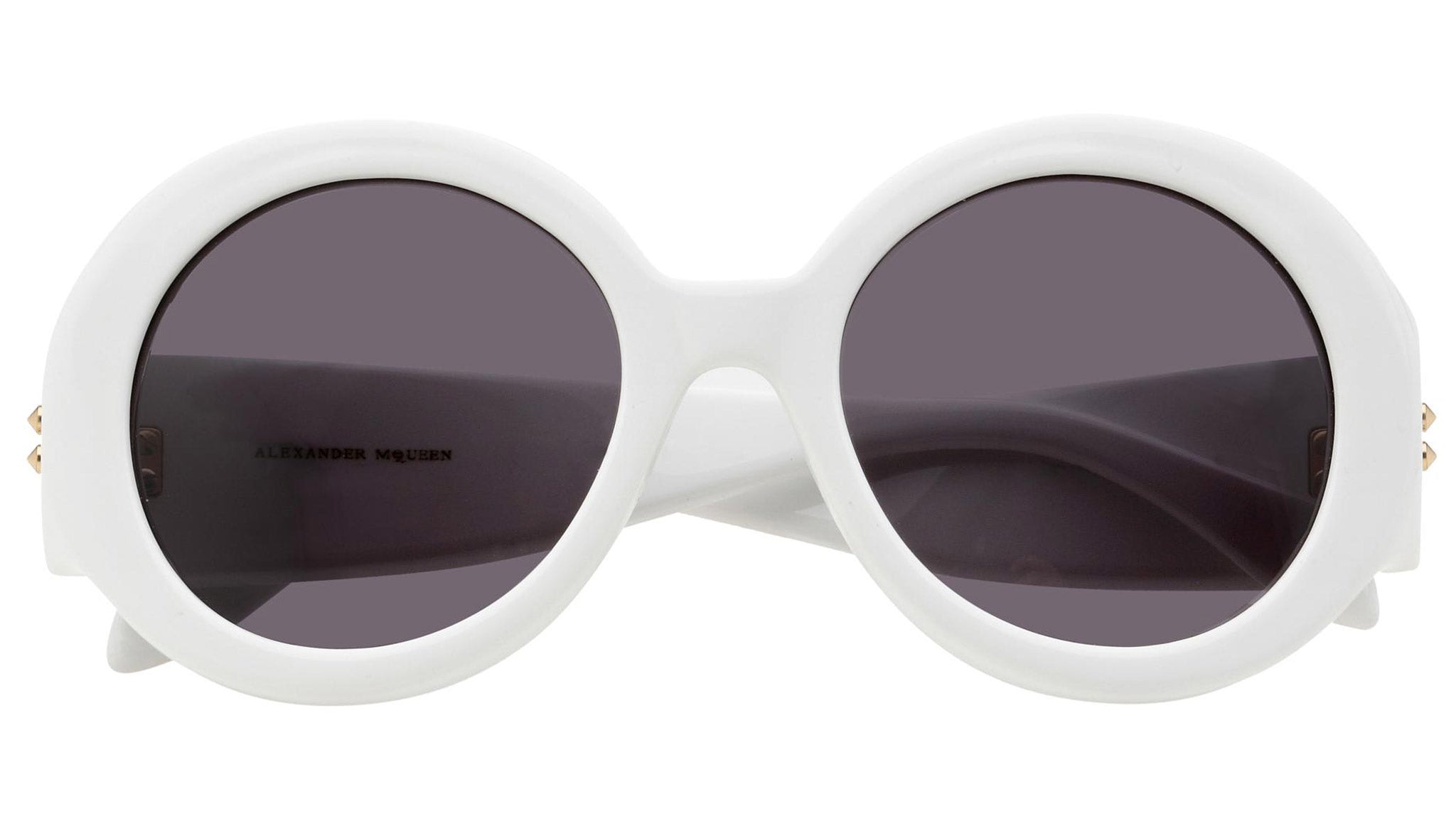 AM0032S 004 sunglasses by Alexander McQueen with shiny optical white frame and solid grey lenses. Alexander McQueen Eyewear eyewear styles represent a juxtaposition between contrasting elements: femininity and masculinity, fragility and strength, tradition and modernity. An innovative and uncompromising identity of the fashion house.