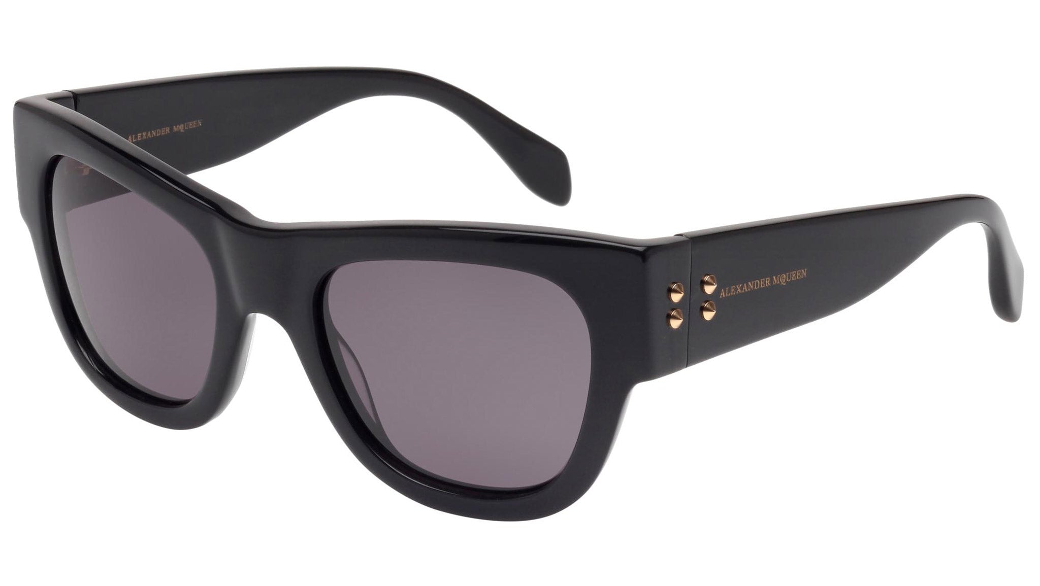 AM0033S 001 sunglasses by Alexander McQueen with shiny black frame and solid grey lenses. Alexander McQueen Eyewear eyewear styles represent a juxtaposition between contrasting elements: femininity and masculinity, fragility and strength, tradition and modernity. An innovative and uncompromising identity of the fashion house.