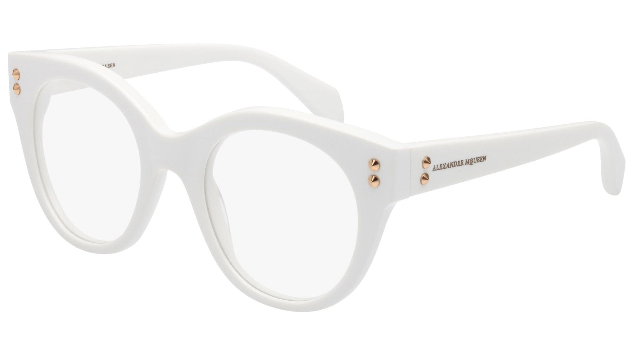 Alexander McQueen optical glasses model AM0035O 004 featuring shiny optical white frame and white colour temple. Synonymous with fearless fashion, Alexander McQueen Eyewear eyewear styles represent a juxtaposition between contrasting elements, as his runway styles are unique and inspiring.