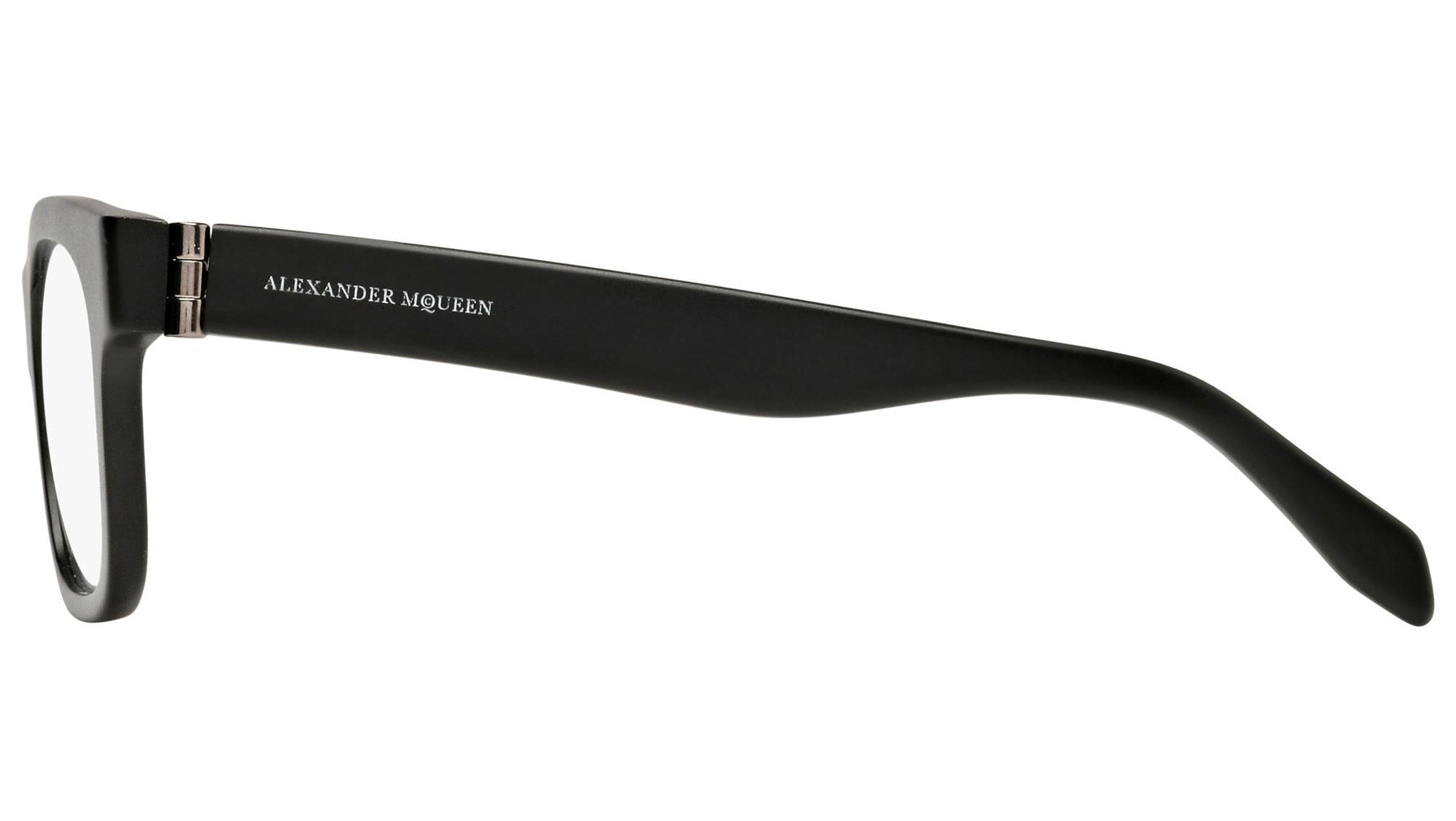 Alexander McQueen optical glasses model AM0038O 001 featuring semimatte black frame and black colour temple. Synonymous with fearless fashion, Alexander McQueen Eyewear eyewear styles represent a juxtaposition between contrasting elements, as his runway styles are unique and inspiring.