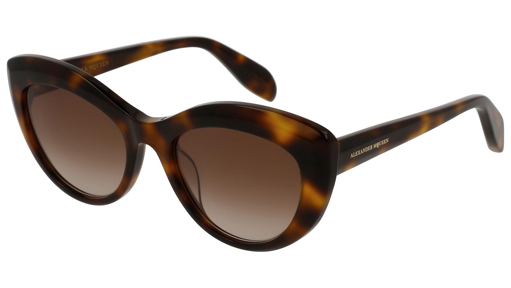 AM0040S 002 sunglasses by Alexander McQueen with shiny light havana frame and gradient brown lenses. Alexander McQueen Eyewear eyewear styles represent a juxtaposition between contrasting elements: femininity and masculinity, fragility and strength, tradition and modernity. An innovative and uncompromising identity of the fashion house.