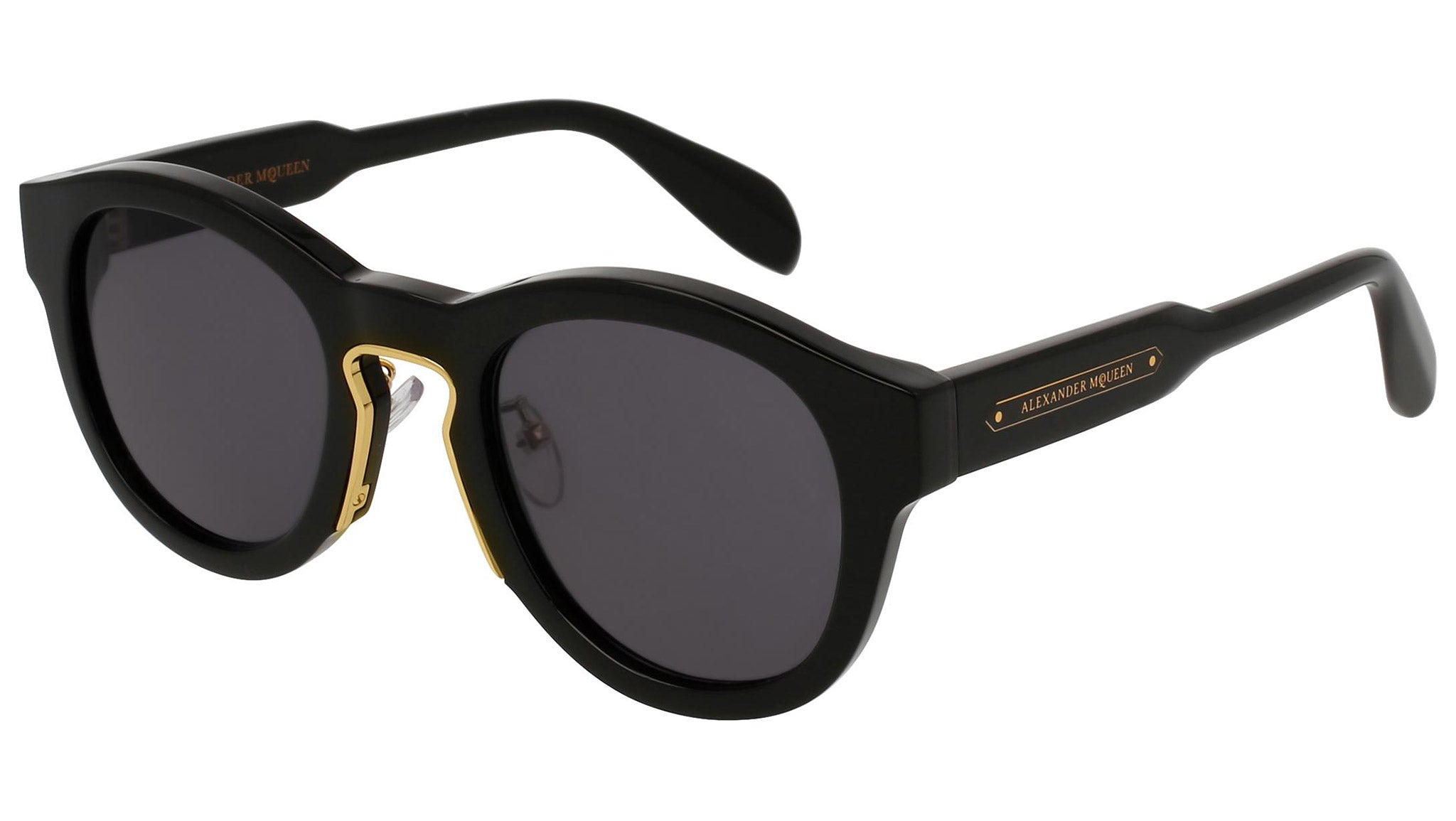 AM0046S 001 sunglasses by Alexander McQueen with shiny black and shiny endura gold frame and solid grey lenses. Alexander McQueen Eyewear eyewear styles represent a juxtaposition between contrasting elements: femininity and masculinity, fragility and strength, tradition and modernity. An innovative and uncompromising identity of the fashion house.