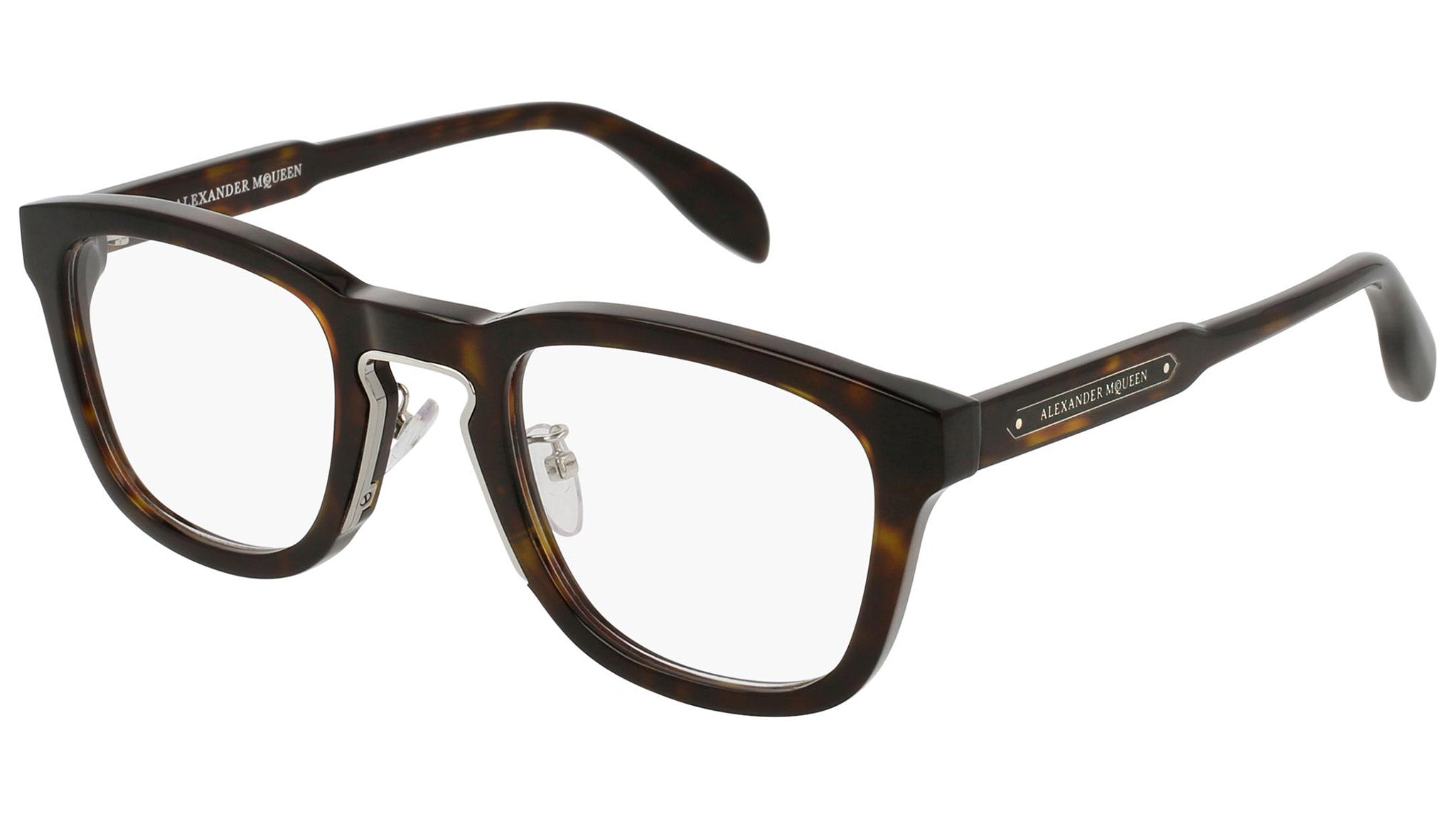 Alexander McQueen optical glasses model AM0048O 004 featuring shiny classic havana and shiny ruthenium frame and havana colour temple. Synonymous with fearless fashion, Alexander McQueen Eyewear eyewear styles represent a juxtaposition between contrasting elements, as his runway styles are unique and inspiring.