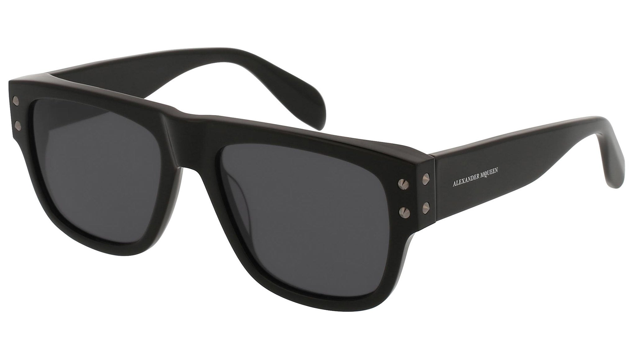 AM0069S 001 sunglasses by Alexander McQueen with shiny black frame and solid grey lenses. Alexander McQueen Eyewear eyewear styles represent a juxtaposition between contrasting elements: femininity and masculinity, fragility and strength, tradition and modernity. An innovative and uncompromising identity of the fashion house.