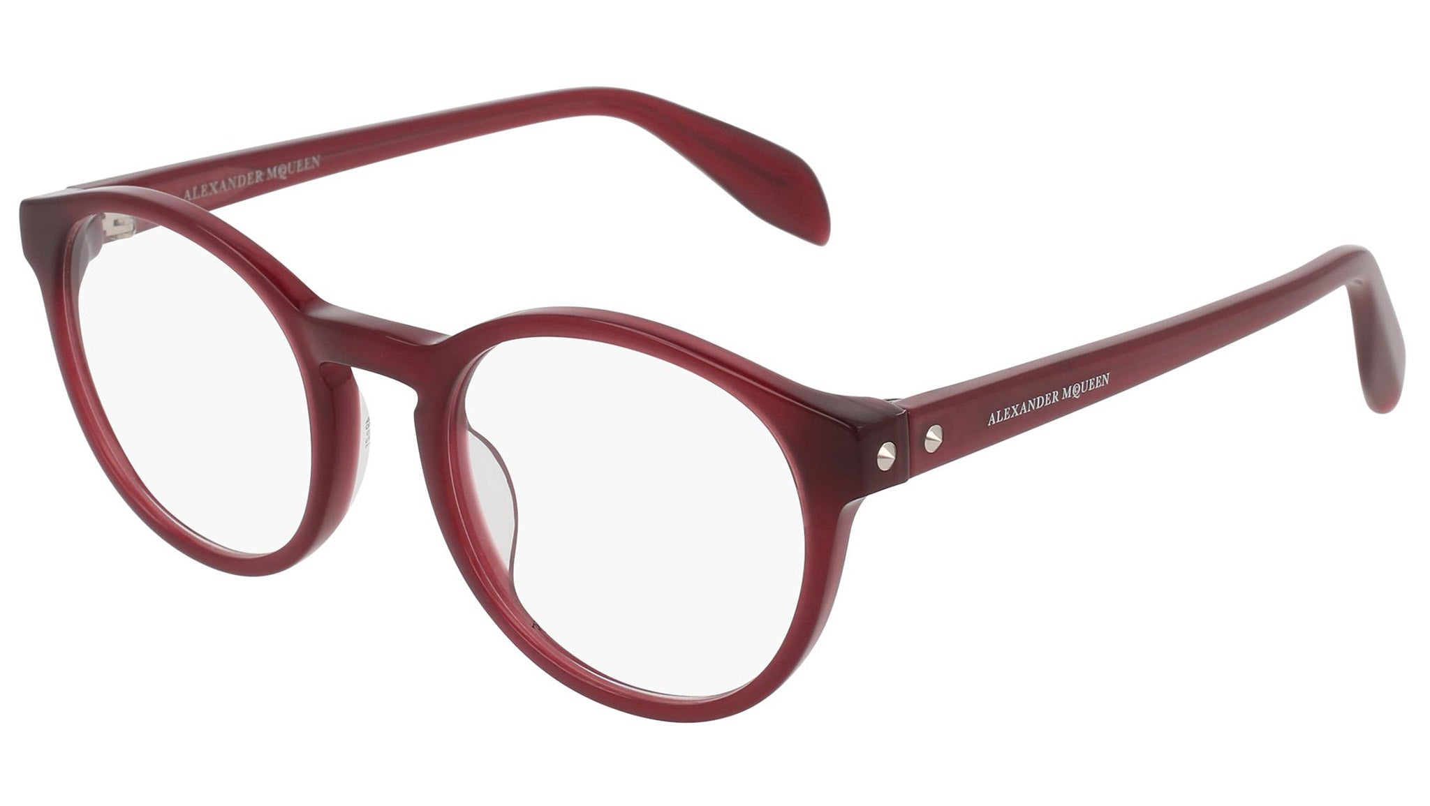 Alexander McQueen optical glasses model AM0075O 003 featuring shiny milky burgundy frame and burgundy colour temple. Synonymous with fearless fashion, Alexander McQueen Eyewear eyewear styles represent a juxtaposition between contrasting elements, as his runway styles are unique and inspiring.