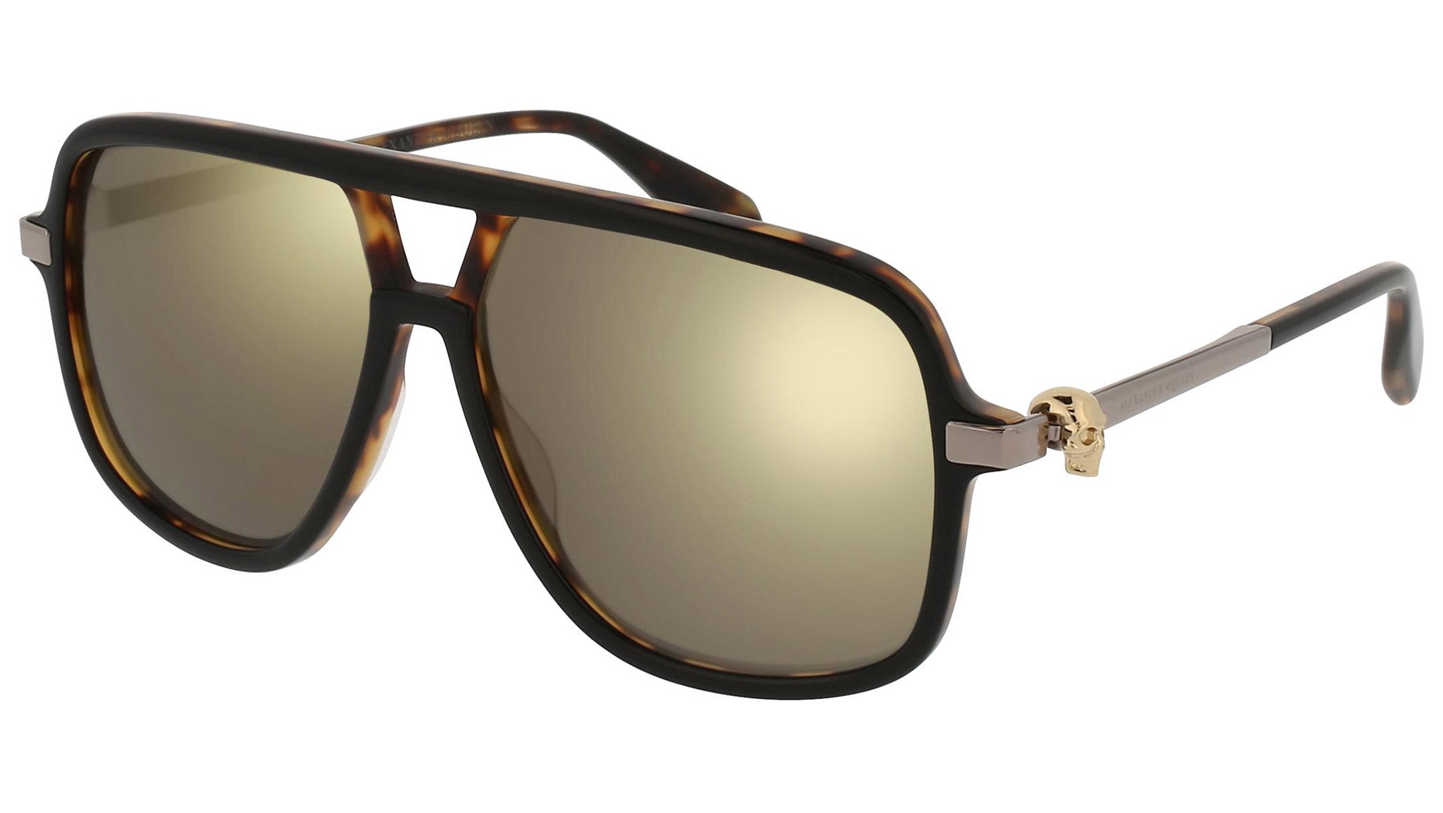 AM0080S 001 sunglasses by Alexander McQueen with shiny black and havana frame and solid grey flash bronze lenses. Alexander McQueen Eyewear eyewear styles represent a juxtaposition between contrasting elements: femininity and masculinity, fragility and strength, tradition and modernity. An innovative and uncompromising identity of the fashion house.
