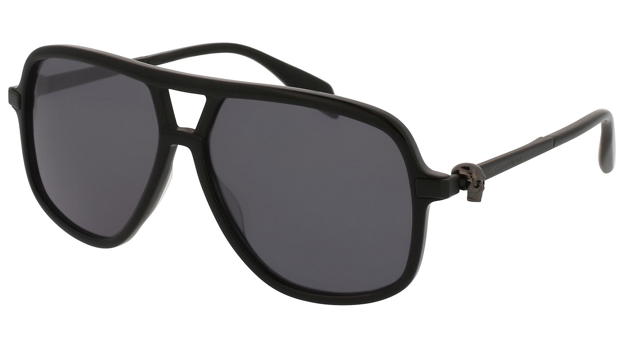 AM0080S 003 sunglasses by Alexander McQueen with shiny black frame and solid grey lenses. Alexander McQueen Eyewear eyewear styles represent a juxtaposition between contrasting elements: femininity and masculinity, fragility and strength, tradition and modernity. An innovative and uncompromising identity of the fashion house.