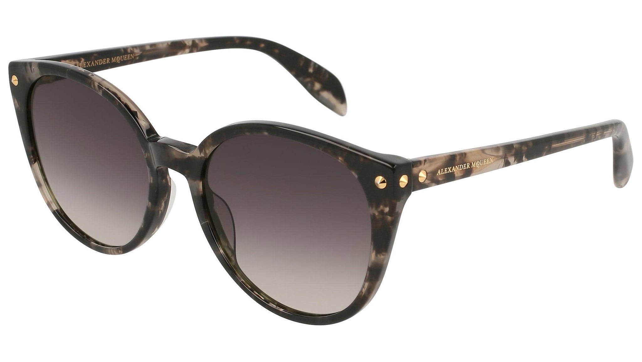 AM0130S 005 sunglasses by Alexander McQueen with shiny grey havana frame and gradient grey lenses. Alexander McQueen Eyewear eyewear styles represent a juxtaposition between contrasting elements: femininity and masculinity, fragility and strength, tradition and modernity. An innovative and uncompromising identity of the fashion house.