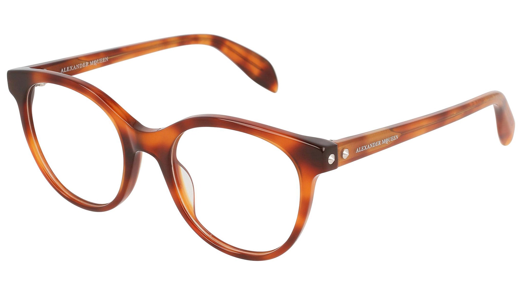 Alexander McQueen optical glasses model AM0131O 003 featuring shiny light havana frame and havana colour temple. Synonymous with fearless fashion, Alexander McQueen Eyewear eyewear styles represent a juxtaposition between contrasting elements, as his runway styles are unique and inspiring.